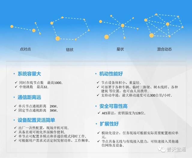 主页(http://www.pttcn.net):无线宽带自组网指挥通信系统 一、系统概述 无线宽带自组网通信指挥系统是在移动自组网基础上进一步拓展的宽带无线通信指挥系统。 无线宽带自组网通信指挥系统解决了现场最后一公里的通信组网问题,能够为使用者构建临时通信指挥网络通道及指挥音视频、数据通信环境,系统支持复杂地形的无线通信传输,可实现快速部署和展开。 无线宽带自组网通信指挥系统可与4G/5G、卫星、地面IP专网等网络互联互通,提供数据、语音和视频业务的指挥调度业务。 无线宽带自组网通信指挥系统可根据应用场景自适应地在空间、频率、通道、传输等多个维度上自由组网,可在短时间内通过自组织方式建立起一个的本地无线宽带通信专网。 无线宽带自组网通信指挥系统可广泛用于军队、公安、武警、应急、人防、交通运输、海事 、电力、地震救援等行业,为用户提供快速灵活的现场无线宽带通信指挥网络。 二、系统拓扑 三、系统功能 四、系统特点 网络形态自组织、抗毁能力强 无线宽带自组网通信指挥系统可根据实际部署情况及需要,自动组织相应网络形态。 单节点发生故障,设备间通信可自动绕过故障节点,实现自动接续。 五、产品介绍 六、典型应用及配置方案 (中国集群通信网 | 责任编辑:张楚生) |