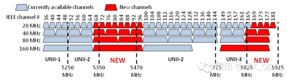 当你看到这张图时,一定彻底混乱了。LTE叫4G,怎么LTE-A也叫4G?准确点说,我们目前使用的LTE技术叫3.9G,LTE-A才是真4G。几年前,日本和韩国的运营商对外宣传时把3.9G统称为4G,于是全世界都这么称呼它了!之所以旧事重提,是希望大家不要把4.5G误以为LTE-A,4.5G比它更牛掰。 首先,看一看4.5G会引入哪些频段? 4.5G时代会引入5GHZ频段。目前在5GHZ上,有大量的频谱资源,这些频段属于Free License,并没有所谓使用授权的限制。在这个频段上,目前全球各国已分配的未授权频谱资源总计超过500MHz。 比如,我们现在使用的WLAN 802.11a就工作于5GHz频段。现在这些频段已经被LTE瞄上了,这就是我们说的LTE-U(Unlicensed LTE,未授权频段LTE)解决方案,该方案通过Unlicensed频段与Licensed频段的有效聚合,可扩大移动宽带网络容量和市场空间。说简单点,就是可以实现LTE和WIFI聚合(当然,不仅仅是Wi-Fi,还有很多其它东东)。