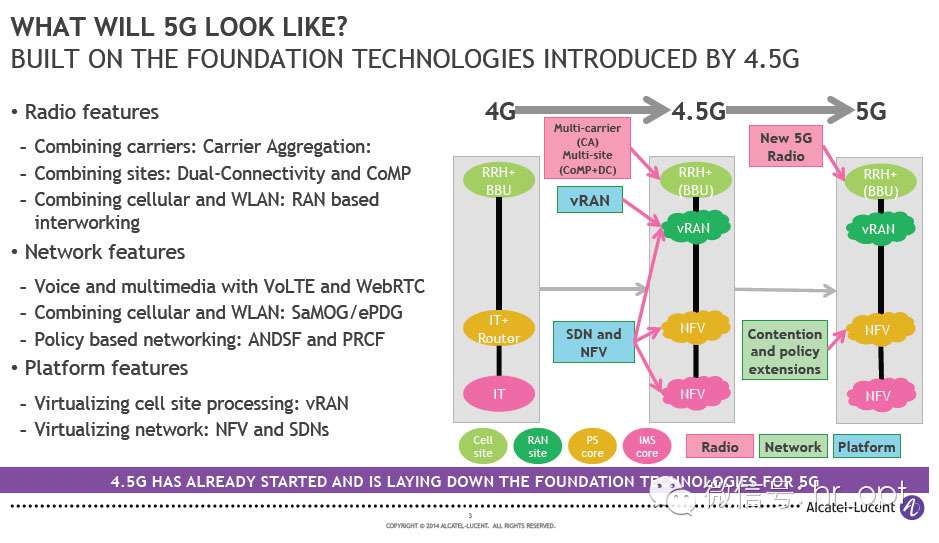 为了理解这个概念,先来看看阿尔卡特朗讯提出的4.5G概念。 阿尔卡特朗讯的4.5G概念提出以下技术特征: 在无线面,阿尔卡特朗讯提出了三个技术特征: 1.载波聚合 2.站点聚合 采用Dual-Connectivity 和CoMP技术。CoMP,协作多点(CoMP,Coordinated Multiple Points)传输技术是指协调的多点发射/接收技术,这里的多点是指地理上分离的多个天线接入点。它是利用光纤连接的天线站点协同在一起为用户服务,相邻的几个天线站或节点同时为一个用户服务,从而提高用户的数据率。 3.LTE小区和WLAN的聚合。 在网络面,也提出了三个功能特征: 1.基于VoLTE和WebRTC的语音和多媒体解决方案。 2.聚合LTE小区和WLAN 3.基于策略的网络:ANDSF 和PCRF 在平台方面向网络虚拟化迈进。