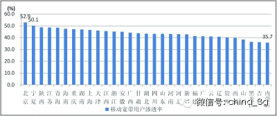 11月,东、中、西部地区移动宽带用户分别比上年末净增7516.4、4075.9、3935.1万户,接近一半净增用户集中在东部地区。东中西部地区移动宽带用户普及情况差异不大,东部地区移动宽带用户渗透率最高,达44.2%,分别比中西部地区高1.8、0.9个百分点。各省间移动宽带用户渗透率差异较小,渗透率高于45%的省份超过三分之一,其中北京全国最高,达到52.9%,内蒙古渗透率最低,达到35.7%。 图11 2014年11月移动宽带用户渗透率各省分布情况