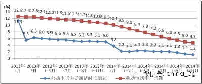 三、电信业务使用情况 移动用户月均通话量持续下降,移动漫游通话量保持稳定增长。在移动电话用户增速明显放缓和互联网应用对话音和短信业务的替代影响下,1~11月,全国移动电话去话通话时长26812.1亿分钟,同比增长1.2%,持续三个月增速下滑。其中,移动非漫游去话通话时长与上年同期持平,移动国内漫游、国际漫游和港澳台漫游去话通话时长分别同比增长11%、5%和3.5%。移动电话用户增速和移动话音业务量增速的差距缩小至3.5个百分点,每用户月均贡献的移动语音业务量持续下降,移动本地去话MOU值为148.5分钟/月·户,移动长途去话MOU值为45.4分钟/月·户,同比分别下降6.1%、5.2%。 图5 2013~2014年各月移动话音业务量和移动用户同比增长比较