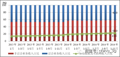 移动数据业务收入增长贡献突出,固定数据业务收入增长减速。1~11月,三家基础电信企业固定数据及互联网业务收入实现1401.5亿元,按可比口径测算同比增长5.0%,增速比上年同期下降3.4个百分点。固定宽带用户增长乏力导致互联网宽带接入业务收入增长减速。移动数据及互联网业务收入实现2447.8亿元,按可比口径测算同比增长42%,比上年同期下降13.3个百分点。移动数据及互联网业务收入在电信业务收入中占比达到23%,比上年同期提高6.4个百分点,拉动电信业务收入增长6.3个百分点。随着移动互联网业务的快速发展和对传统电信业务的替代,移动数据及互联网业务在推动电信业务收入增长方面的作用愈加突出。 图9 2013年~2014年各月话音、非话音、移动数据及互联网收入占比情况