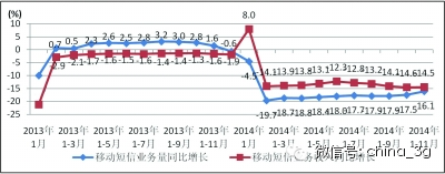 移动短彩信量降幅小幅收窄,移动短信业务收入规模同比减少超80亿元。1~11月,全国移动短信业务量6979亿条,同比下降16.1%,比1~10月收窄1.4个百分点。由移动用户主动发起的点对点短信量占比持续下降,占移动短信业务量比重由上年同期的48.2%降至46.6%,其中月户均点对点短信量同比减少9条,达到37.2条。移动短信业务收入同比下降14.5%,比1~10月收窄0.1个百分点,收入规模同比减少82.7亿元。微信等新型即时消息类应用影响下,彩信业务量同比下降26.8%,比1~10月收窄0.4个百分点,发送总量590.7亿条。 图6 2013~2014年各月移动短信业务量和移动短信收入同比增长情况