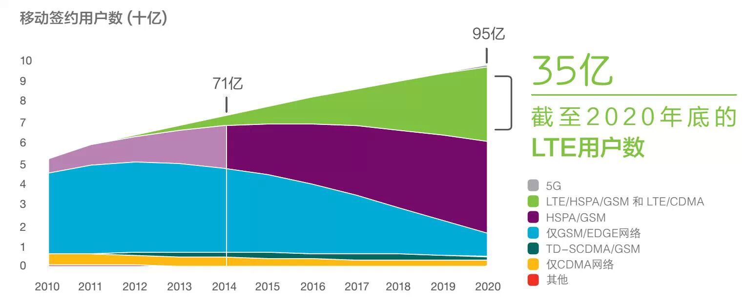 主页(http://www.pttcn.net):2015年LTE全面推进,VoLTE启动商用 “回顾2014年全球电信市场,LTE网络的快速建设令人印象深刻;展望2015年,虽然中国移动的建设速度将有所放缓,但是中国电信和中国联通的跟进,以及全球其他国家的稳步发展,都将促进LTE网络建设继续稳健推进。”爱立信中国首席市场官常刚近日表示。 常刚认为,在2014年的世界经济迷茫暗夜里,ICT产业得益于LTE在全球的迅速普及和用户的快速增长,而成为难得的“北辰之星”。在它的照耀之下,网络社会的大潮正汹涌而来,加速推动人与人、人与物和物与物之间的普遍连接,促进不同类型产业之间的深度融合,新的产业类型呼之欲出。 中国力量主导LTE新增市场 在过去的2014年,LTE毫无疑问成为全球运营商建设的热点。在中国,中国移动到年底建成70万个基站,用户规模超过了9000万,成为全球LTE市场最耀眼的明星;在美国,第一大LTE运营商Verizon推出了XLTE,强调与其他运营商相比可以利用新获得的频谱带来双倍的下行用户体验;在LTE发展最快的韩国,LTE用户渗透率已经接近80%。 总体来看,2014年全球的LTE用户规模同比增长了45%,达到4.4亿左右,创造了史无前例的速度,而中国的LTE用户已经突破9000万,月均用户增长率超过50%。爱立信预计2020年,全球的LTE用户将达到35亿,占整个移动宽带用户的42%左右(如图所示)。其中,中国市场的用户规模将达到约12亿,占全球用户总数的1/3左右。