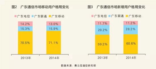 用户市场饱和情况下,运营商将更多精力放在存量用户维系及用户结构优化上。2G用户不断向3G/4G迁移,成为这一年用户流动的主要方向。到2014年底,广东移动的4G套餐用户数量(包括新增及存量迁移用户)已经接近3000万,在移动客户中的占比由年初的不到百分之一增至到年底的接近四分之一。广东联通在3G/4G发展的带动下,用户结构也进一步向3G/4G倾斜,到2014年底,34G/4G用户占比已超过40%,比2013年底提升3.5个百分点。 四、4G领跑,广东移动一家独大 2014年移动通信市场最大的竞争焦点非“4G”莫属。在获得相应牌照后,三家运营商陆续展开4G运营,其中广东移动从2013年底开始布局4G ,到2014年底已有超过一年的运营经验。这一年来,广东移动优先从存量客户入手,以“换卡、换套餐、换手机”三个步骤不断引导2G/3G客户向4G迁移。得益于其庞大的存量客户基础,广东移动4G发展速度可以说是“一骑绝尘”。此外,完善的网络覆盖、丰富的4G产品体系、良好的品牌口碑等诸多有利因素均使新增市场重新倒向广东移动一边。这一年可谓是广东移动重新扬眉吐气的一年。到年底交出的4G成绩单颇令人满意。 与此相反,广东联通和广东电信的4G发展道路显得颇为曲折。一方面,两者寄予厚望的FDD牌照迟迟不发放,即便年中拿到一部分“试验牌照”,也只是“挤牙膏”般挤出来的一点,完全满足不了全面发展的需求。另一方面,联通和电信在4G发展上的态度也极大的影响了前进的步伐。前期广东联通割舍不了3G时代的优越感,一心想把3G时代的优势平滑到4G上,以“3G/4G一体化”的运营思路开启了4G旅程。不曾想用户并不买账。到第四季度终于决心摆脱“一体化”名号,提出“双4G”正面迎接竞争,但为时稍晚,用户量还是没能有大突破。广东电信对待4G的态度颇为谨慎,直到FDD试验牌照发放才正式启动4G营销。但得益于前期铺设及坚定的发展态度,4G用户量增长速度较快。到年底,广东电信的4G用户规模已经超过广东联通。
