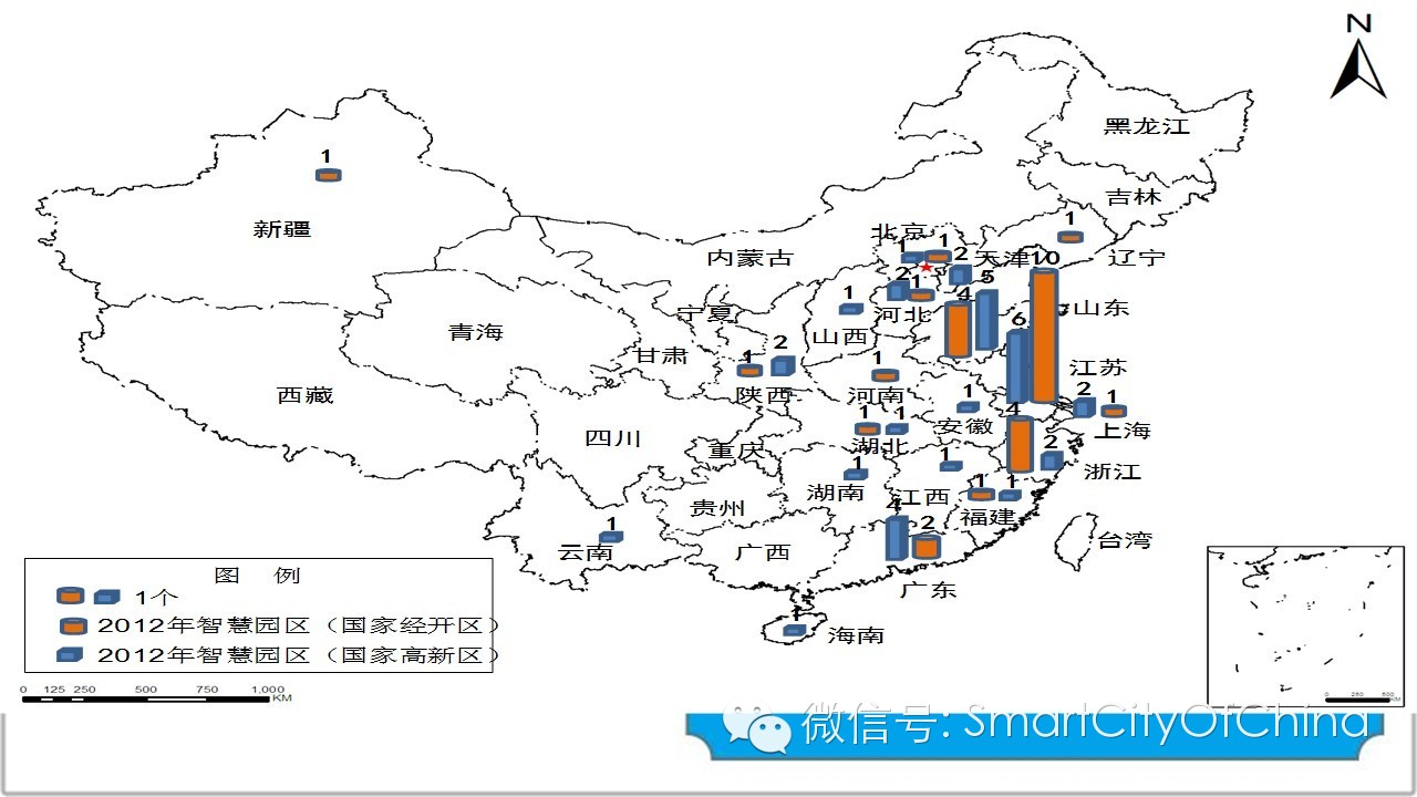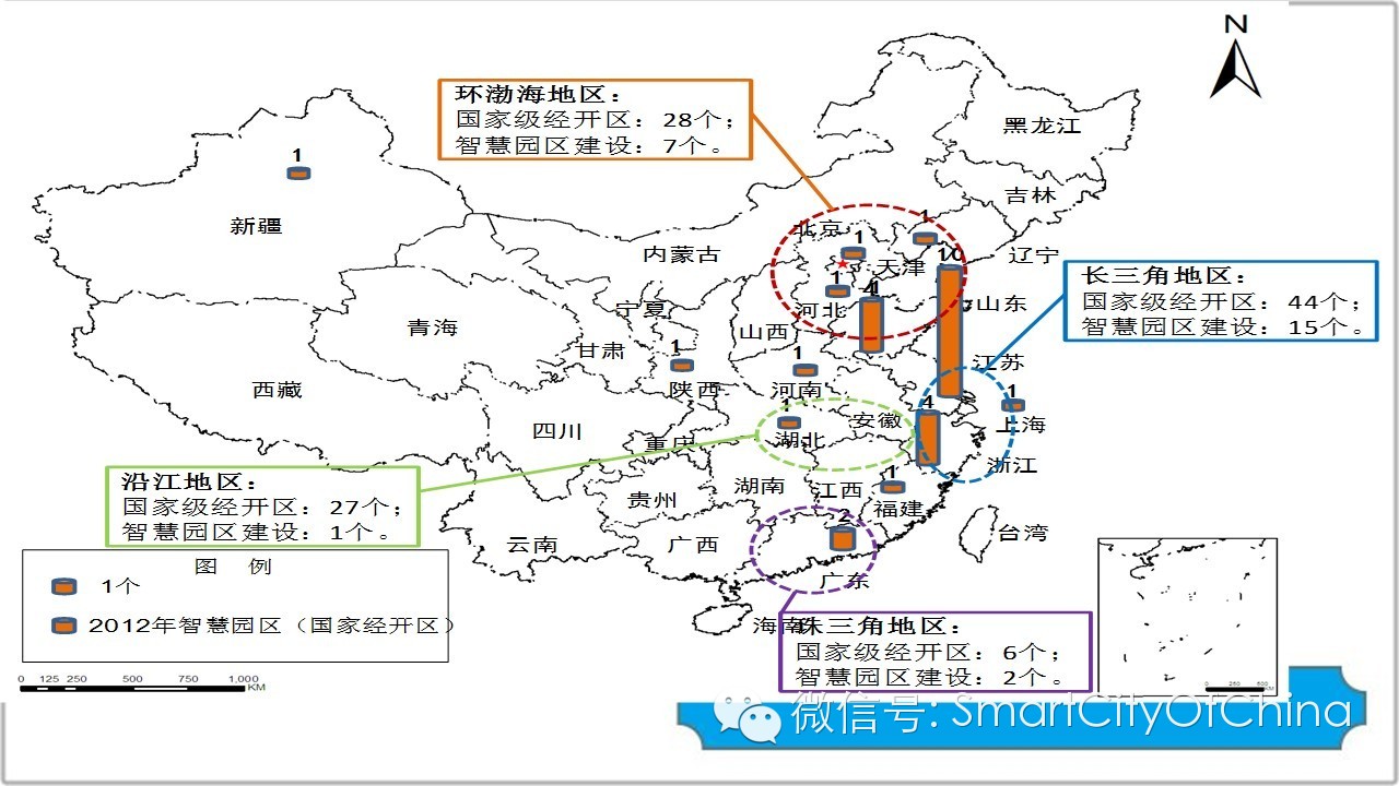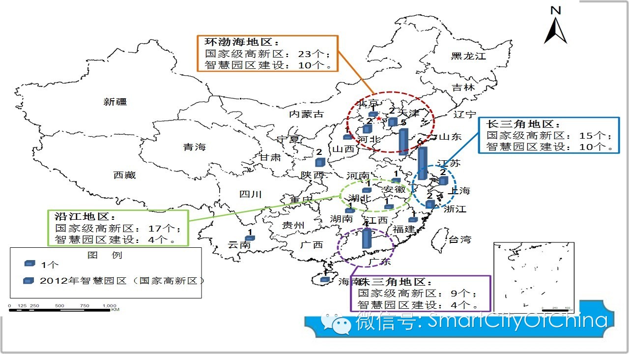 五、中国智慧园区不同类型的园区分布一、国家级高新区智慧园区分布 1、智慧园区建设分布 截止到2012年底,全国共有国家高新区106个,其中有34个正在有序推进智慧园区建设,占比32%。 从区域角度来看,环渤海地区(北京、天津、河北、辽宁)共有国家高新区23个,其中有10个正在进行智慧园区建设,占比43%;长三角地区(上海、江苏、浙江)共有国家高新区15个,其中有10个正在进行智慧园区建设,占比达67%;沿江城市群(安徽、江西、湖南、湖北)共有国家高新区17个,其中有4个正在进行智慧园区建设,占比24%;珠三角地区(广东)共有国家高新区9个,其中有4个正在进行智慧园区建设,占比44%;其他地区合计共有国家高新区42个,其中有6个正在进行智慧园区建设,占比14%。具体分布如下图所示: 图7国家级高新区智慧园区建设分布图