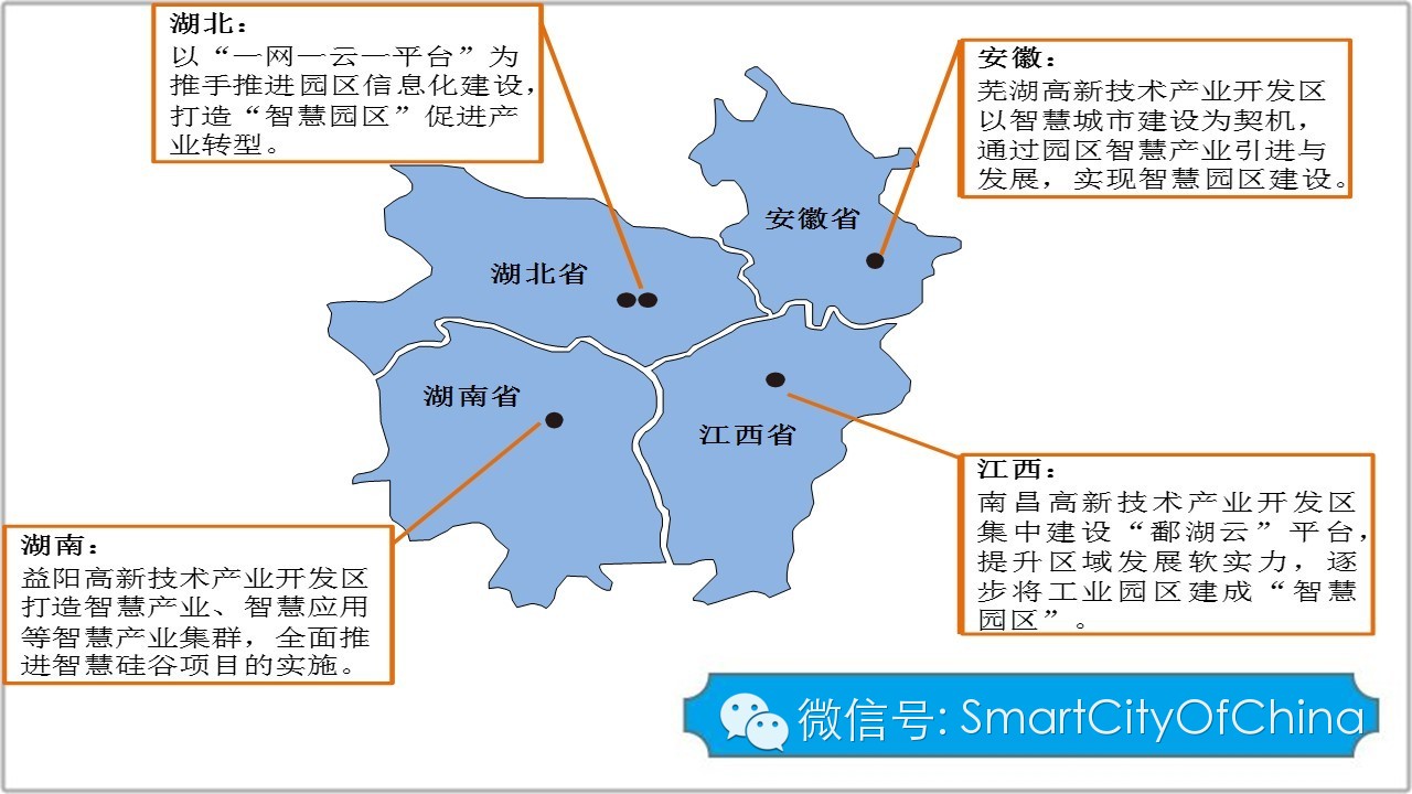 3、沿江区域 自《促进中部地区崛起规划》颁布实施以来,沿江城市群在政策支持方面获得了前所未有的发展机遇。与此同时,随着东部沿海地区产业转移趋势越加明显,中西部地区承接东部沿海地区产业转移契机凸显,使得中国沿江地区智慧园区建设也迎来了自己的春天。 安徽省 芜湖高新技术产业开发区以智慧城市建设为契机,通过园区智慧产业引进与发展,以信息技术推动园区产业结构调整,通过工业园区产业结构的调整升级为智慧城市建设提供扎实的工业基础,从为安徽省沿江城市带崛起打造了崛起的平台。 江西省 工业园区是江西省对外开放的主阵地,更是江西省结构调整、产业转型升级的重要载体。江西移动为工业园区和重大项目提供完善的信息化基础设施,在光纤入园和无线宽带的基础上集中建设“鄱湖云”平台,为政府提供园区管理、信息门户,为园区企业综合提供远程计算、行业测试等公共技术服务,提升区域发展软实力,逐步将工业园区建成“智慧园区”。随着多年实践,“智慧园区”已在赣鄱大地初具规模,以南昌高新技术产业开发区的智慧园区建设最为代表,目前该园区政府服务不断改善、企业信息化水平不断提升。 湖南省 随着湖南省工业经济的快速发展,湖南省工业园区在物联网、云技术、软件开发等智慧产业方面和以智慧建筑、智慧物业、智慧政务为主的智慧应用方面都取得了长足的发展。其中,益阳高新区智慧硅谷项目的实施将形成一个庞大的智慧产业集群。这必要进一步带动其在智慧设计、智慧培训、智慧研发、智慧产业、智慧应用等方面的发展。 湖北省 湖北省在打造“湖北慧更好”工程中,以“一网一云一平台”为推手推进园区信息化建设,打造“智慧园区”促进产业转型。其中,“一张网”为园区提供WLAN、3G等高速无线网络覆盖及光纤接入覆盖;“一朵云”为企业实现资源共享,减少因为信息孤岛带来的管理困惑;“一个平台”使企业员工通过手机各种无线终端随时、随地、随需获得各种服务信息下,园区的服务水平和管理效率得到了极大提升。 图4沿江地区智慧园区建设格局