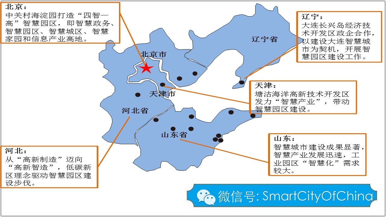 二、智慧园区重点建设区域 1、环渤海区域 环渤海地区拥有大量大型企业总部和重点科研院校,是国内科技创新资源最为密集的地区。环渤海地区拥有23个国家高新区、28个国家经开区,园区经济发展迅速,智慧园区建设需求旺盛,截止到2012年底,环渤海地区共有17个园区提出或正在进行智慧园区建设,其中国家高新区10个,国家经开区7个。 北京市 人才与科技资源集中,具有雄厚的智慧园区建设支持资源。北京市智慧园区建设以中关村科技园海淀园为代表,该园区从智慧政务、智慧园区、智慧城区、智慧家园和信息产业高地几个方面协同入手,努力打造顶级智慧园区。 天津市 天津毗邻北京市,在智慧园区建设过程中不断提升综合发展能力、科技创新能力、规模经济能力、国际竞争能力和辐射带动能力,其中天津滨海新区塘沽海洋高新技术开发区以智慧产业为跳板,基本建成战略性新兴产业集聚,金融和商业服务日益完善,园区创新能力较强,高端产业和高端人才相对集聚的智慧型新园区。 辽宁省 大连长兴岛经济技术开发区以智慧城市建设为契机,与移动运营商在网络基础设施建设、政府信息化建设、智慧城市重点项目建设、社会重点领域信息化应用服务、主导产业和重点工业园区信息化建设、三网融合等方面开展深度合作,为智慧城市建设、智慧园区提供支撑和保障。 河北省 保定高新技术产业开发区以智慧城市建设带动智慧园区建设,通过政府主导,高校支撑,企业参与,建立一个以“智慧”为主题的高端园区,并以此带动相关产业链的发展,推进园区产业由“高新制造”迈向“高新智造”。 山东省 智慧城市建设成果显著,智慧产业发展迅速,工业园区“智慧化”需求较大。2013年“智慧山东”正式开展试点后,选择潍坊、威海等市作为“智慧城市”试点,以济宁市任城区等为“智慧城区”试点,以枣庄市安乔东城国际小区等为“智慧社区”试点,在济南、淄博市等开展“智慧工业园区”试点。山东省智慧园区建设工程正蓬勃开展。其中,威海火炬高技术产业开发区、青岛高新技术产业开发区、济南高新技术产业开发区、东营经济技术开发区、德州经济技术开发区等园区相继开展了“智慧园区”规划设计和工程建设。 图2环渤海地区智慧园区建设格局