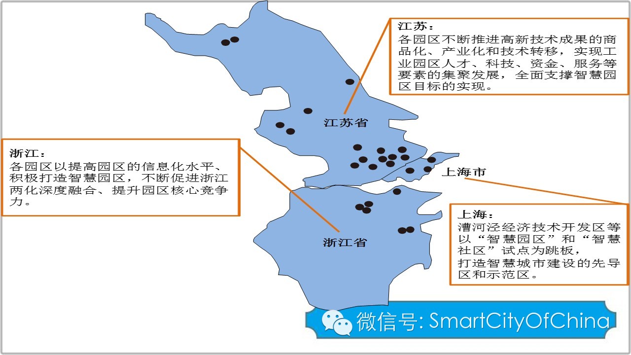 2、长三角区域 长三角地区经济基础雄厚,产业配套齐全。区域内工业园区林立,智慧园区建设数量位列全国之首。截止到2012年底,长三角地区共有15个国家级高新区、44个国家级经开区;共有25个园区提出或正在进行智慧园区建设,其中国家级高新区10个,国家级经开区15个。 上海市 以“智慧园区”试点为跳板,及时总结提炼试点推进过程中的有效模式和成功经验,进一步深化试点内容,不断扩大试点范围。上海市张江高科技园区、漕河泾经济技术开发区、上海紫竹高新技术产业开发区在智慧园区具体建设中,注重项目“科技含金量”,变产业招商为智慧招商;建设园区智能电网体系,加快产业结构调整;应用智能化完善园区配套设施,改善投资环境;主抓低碳项目,推进产业结构调整;加强企业管理、强化服务意识,不断将上海市智慧园区建设浪潮推向顶峰,以打造智慧城市建设的先导区和示范区。 江苏省 江苏省经济基础良好,智慧园区建设领跑全国。目前全省9个国家高新区中有6个进行了智慧园区建设;22个国家经开区中有10个进行了智慧园区建设。未来,江苏省各工业园区将通过“智慧园区”建设不断促进高新技术成果的商品化、产业化和技术转移,培育拥有自主知识产权、市场空间广阔、成长前景良好、科技含量较高、爆发力较强、关联带动效应大的科技创新型企业,建设成为高端产业孵化基地、高层次创新创业人才集聚基地、高科技成果转化基地和高端服务业示范基地,全面支撑智慧园区目标的实现。 浙江省 园区是工业发展的重要平台和载体,是浙江省工业转型升级的主战场,提高园区的信息化水平、积极打造智慧园区,是促进浙江两化深度融合、提升园区核心竞争力的重要保障。杭州高新技术产业开发区、杭州经济技术开发区等园区在推进智慧园区建设过程中不断探索“智慧创造”之路,从而为智慧城市打造强有力的智慧源。 图3长三角地区智慧园区建设格局