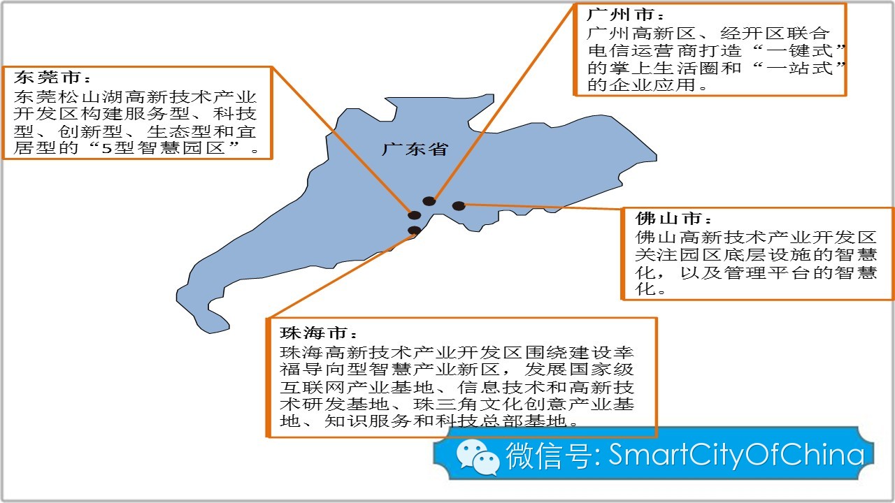 4、珠三角区域 珠三角地区经济发展迅速,产业集中度较高。工业园建设走在全国前列,智慧园区建设也取得了较大的成果。目前珠三角区域内共有国家级高新区9个,提出建设智慧园区的有4个;国家级经济开区6个,提出建设智慧园区的有2个。 广州市 广州高新技术产业开发区等园区联合电信运营商共同为园区打造“一键式”的掌上生活圈和“一站式”的企业应用,助力提升园区和企业的管理水平、运营效率。 佛山市 借助佛山跻身中国智慧城市发展水平第一梯队机遇,佛山高新技术产业开发区引入电信运营商、IBM企业推进佛山智慧园区建设,重点应关注园区底层设施的智慧化,以及管理平台的智慧化。 珠海市 珠海高新技术产业开发区围绕建设幸福导向型智慧产业新区,珠海高新区将把产业发展定位于人的幸福需求上,“以人为本”选择产业发展方向和重点领域,为建设幸福社会提供坚实物质基础和高端的产业技术载体,发展国家级互联网产业基地、信息技术和高新技术研发基地、珠三角文化创意产业基地、知识服务和科技总部基地。 东莞市 东莞松山湖高新技术产业开发区通过园区“一张网”、“一张图”、“一片云”、“一套库”、“一把锁”,5个统一的信息化基础设施,提升高新区基础设施的集约化、系统化和承载能力;以互联互通和共享协同为主线,建设政务管理、产业服务、社会民生、绿色园区和平安园区共“5大应用板块、16个重点项目、81个子项目”的建设,构建服务型、科技型、创新型、生态型和宜居型的“5型智慧园区”。 图5珠三角地区智慧园区建设格局