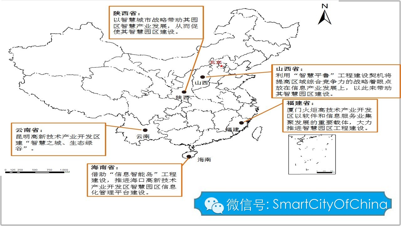 5、其他区域 陕西省 2012年4月西安与北京、杭州、武汉、宁波共同入选中国工程院确立的“中国智慧城市”试点城市名单,西安正式向“智慧城市”迈进,西安高新区、西安经济技术开发区以其教育和科技资源集聚、比较优势明显、支撑作用强等有利条件,大力发展智慧产业,推进西安高新技术产业开发区、西安经济技术开发区智慧园区建设、杨凌农业高新技术产业示范区智慧农业建设。 山西省 利用“智慧平鲁”工程建设契机将提高区域综合竞争力的战略着眼点放在信息产业发展上,并将信息资源高效融合共享作为该区创新社会服务管理的核心举措,以此来带动其智慧园区建设。 福建省 厦门火炬高技术产业开发区以软件和信息服务业集聚发展的重要载体,大力推进智慧园区工程建设,将其打造成智能化管理的安全园区、低碳节能环保的生态园区、多家运营商提供服务的光网园区、生产生活智能应用园区、交通智能化园区、“云端”服务园区。 海南省 借助“信息智能岛”工程建设,推进海口高新技术产业开发区智慧园区信息化管理平台建设。 云南省 昆明高新技术产业开发区建“智慧之城、生态绿谷”。 图6其他地区智慧园区建设格局