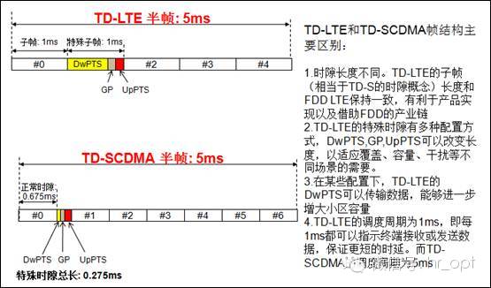 特殊时隙功能: DwPTS:最多12个symbol,最少3个symbol,可用于传送下行数据和信令 UpPTS:UpPTS上不发任何控制信令或数据,UpPTS长度为2个或1个symbol,2个符号时用于短RACH或Sounding RS,1个符号时只用于sounding GP: a) 保证距离天线远近不同的UE的上行信号在eNB的天线空口对齐 b) 提供上下行转化时间(eNB的上行到下行的转换实际也有一个很小转换时间Tud,小于20us) c) GP大小决定了支持小区半径的大小,LTE TDD最大可以支持100km d) 避免相邻基站间上下行干扰 目前F频段上下行时隙配比为1:3,特殊时隙为3:9:2(SA2,SSP5); D\E频段上下行时隙配比为2:2,特殊时隙为10:2:2(SA1,SSP7); 15. LTE无线帧与TDS无线帧有什么区别,如何配置来降低LTE与TDS之间的干扰//为匹配TDS组网,TDL的时隙配比是多少?