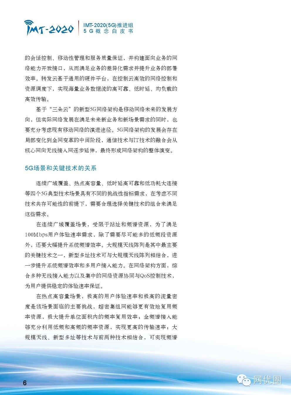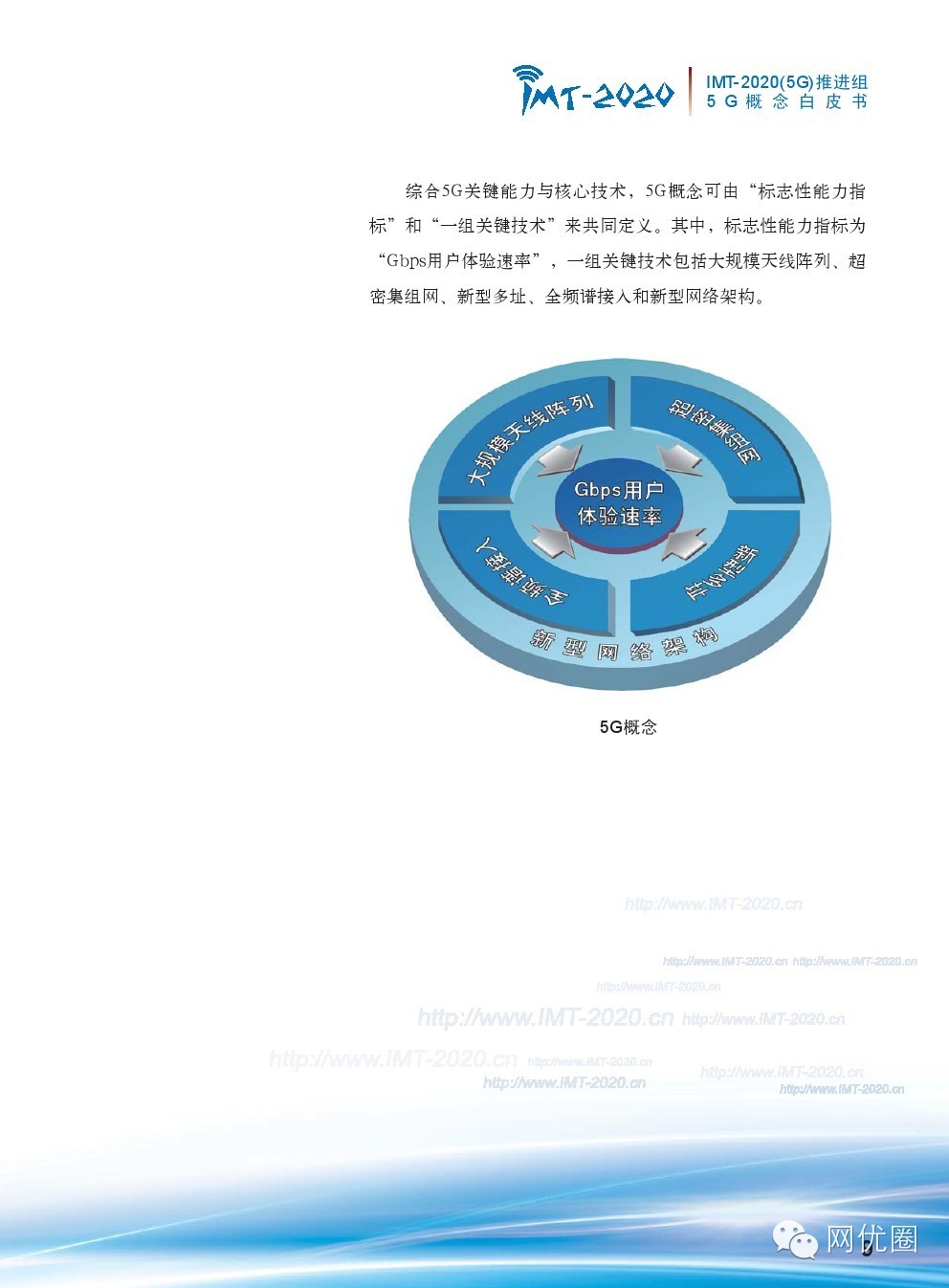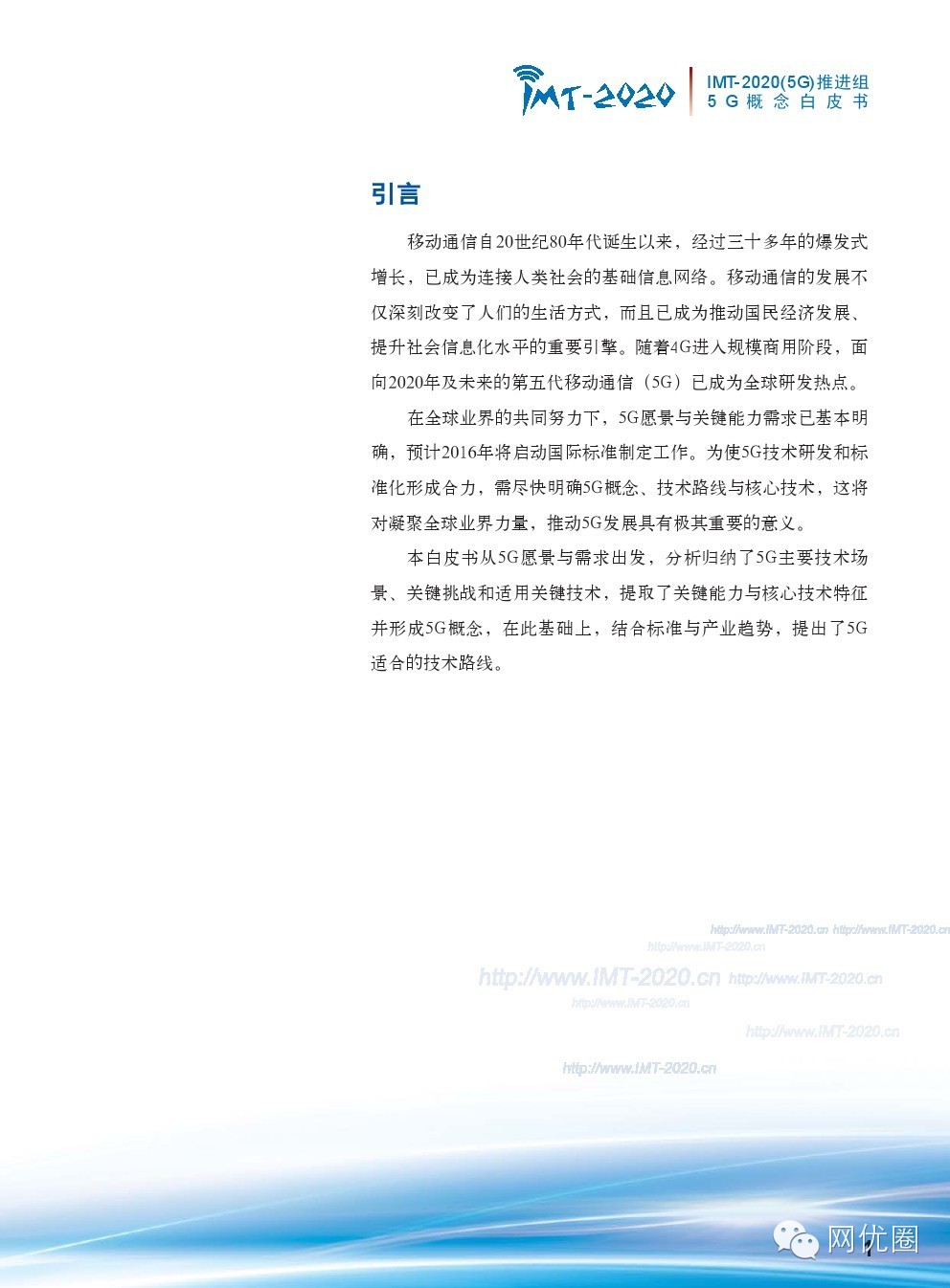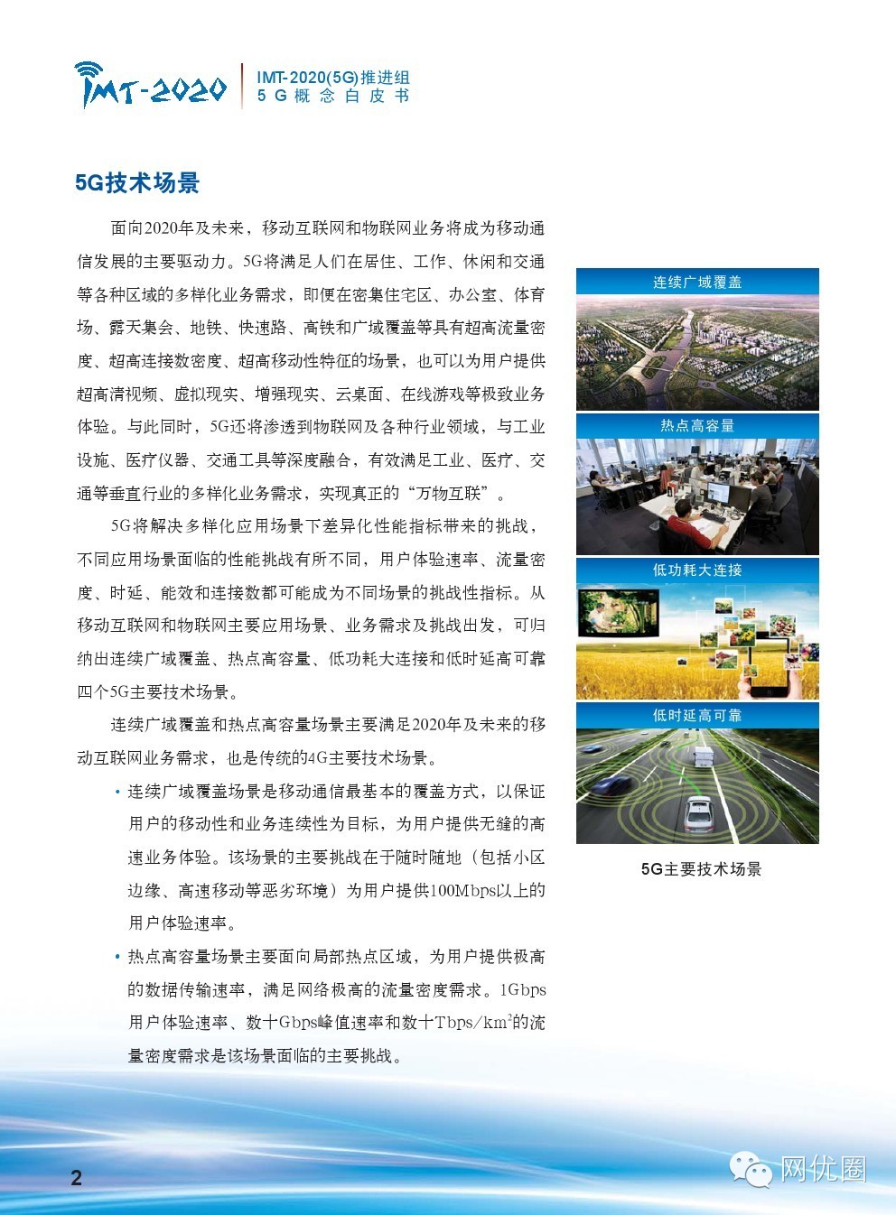 主页(http://www.pttcn.net):IMT-2020(5G)推进组:5G概念白皮书 【摘 要】 移动通信自20世纪80年代诞生以来,经过三十多年的爆发式增长,已成为连接人类社会的基础信息网络。移动通信的发展不仅深刻改变了人们的生活方式,而且已成为推动国民经济发展、提升社会信息化水平的重要引擎。随着4G进入规模商用阶段,面向2020年及未来的第五代移动通信(5G)已成为全球研发热点。在全球业界的共同努力下,5G愿景与关键能力需求已基本明确,预计2016年将启动国际标准制定工作。为使5G技术研发和标准化形成合力,需尽快明确5G概念、技术路线与核心技术,这将对凝聚全球业界力量,推动5G发展具有极其重要的意义。本白皮书从5G愿景与需求出发,分析归纳了5G主要技术场景、关键挑战和适用关键技术,提取了关键能力与核心技术特征并形成5G概念,在此基础上,结合标准与产业趋势,提出了5G适合的技术路线。 【目 录】 一、引言 二、5G技术场景 三、5G关键技术 四、5G概念 五、5G技术路线 六、总结与展望 七、主要贡献单位