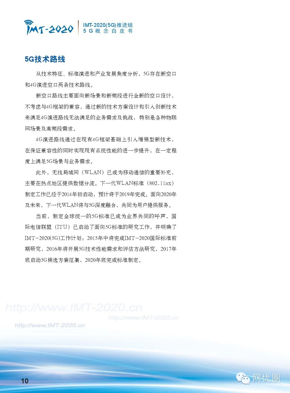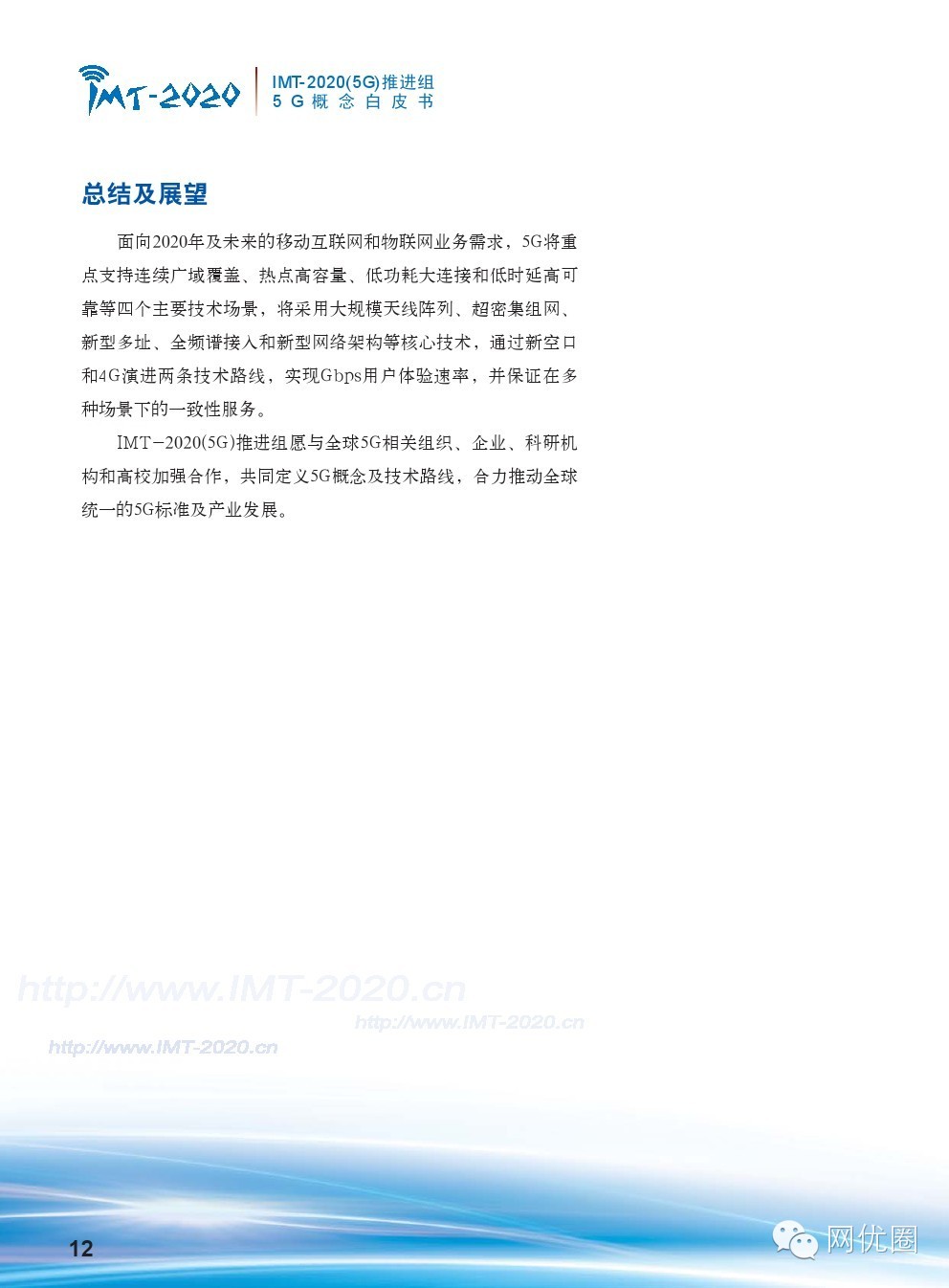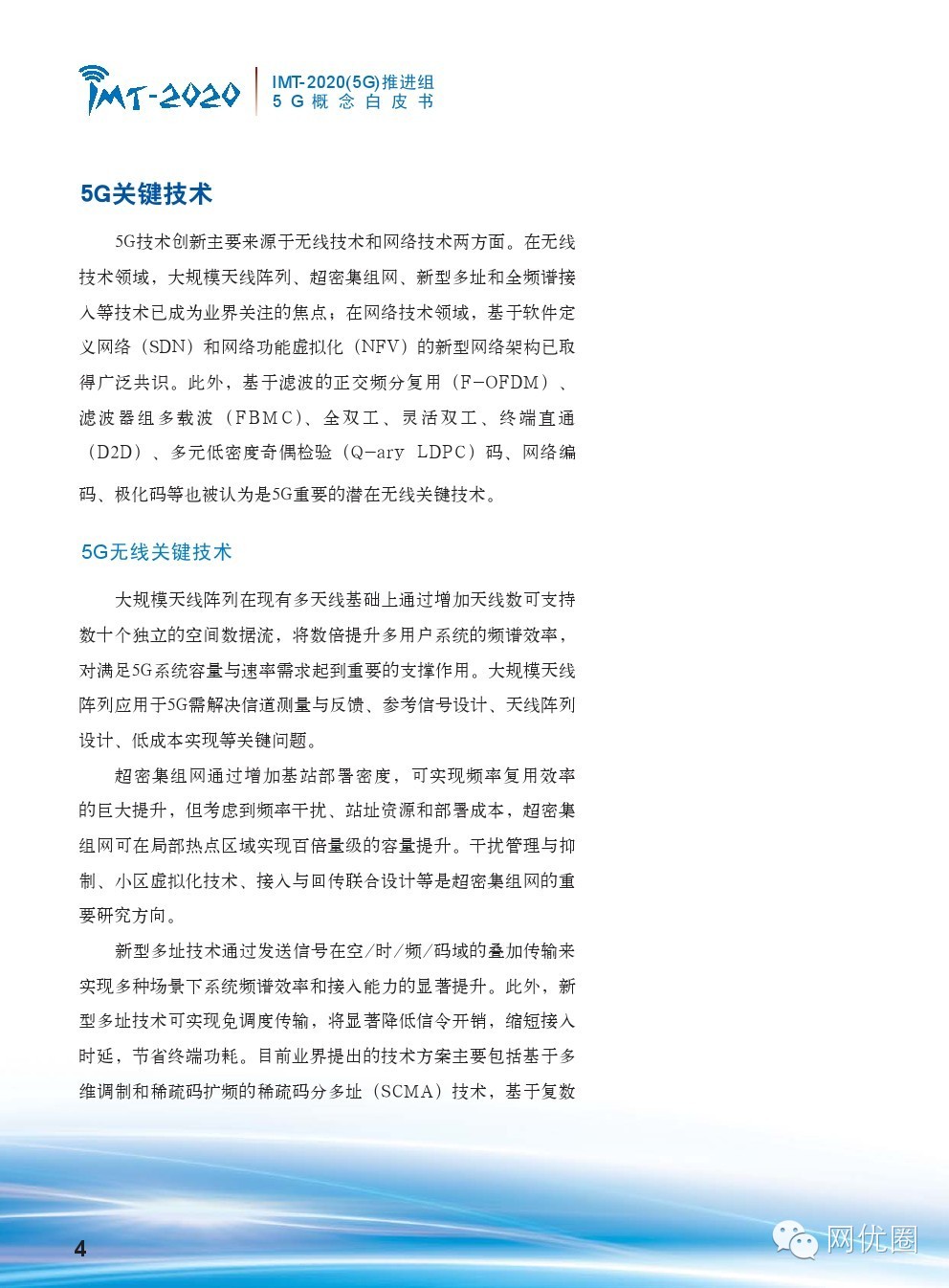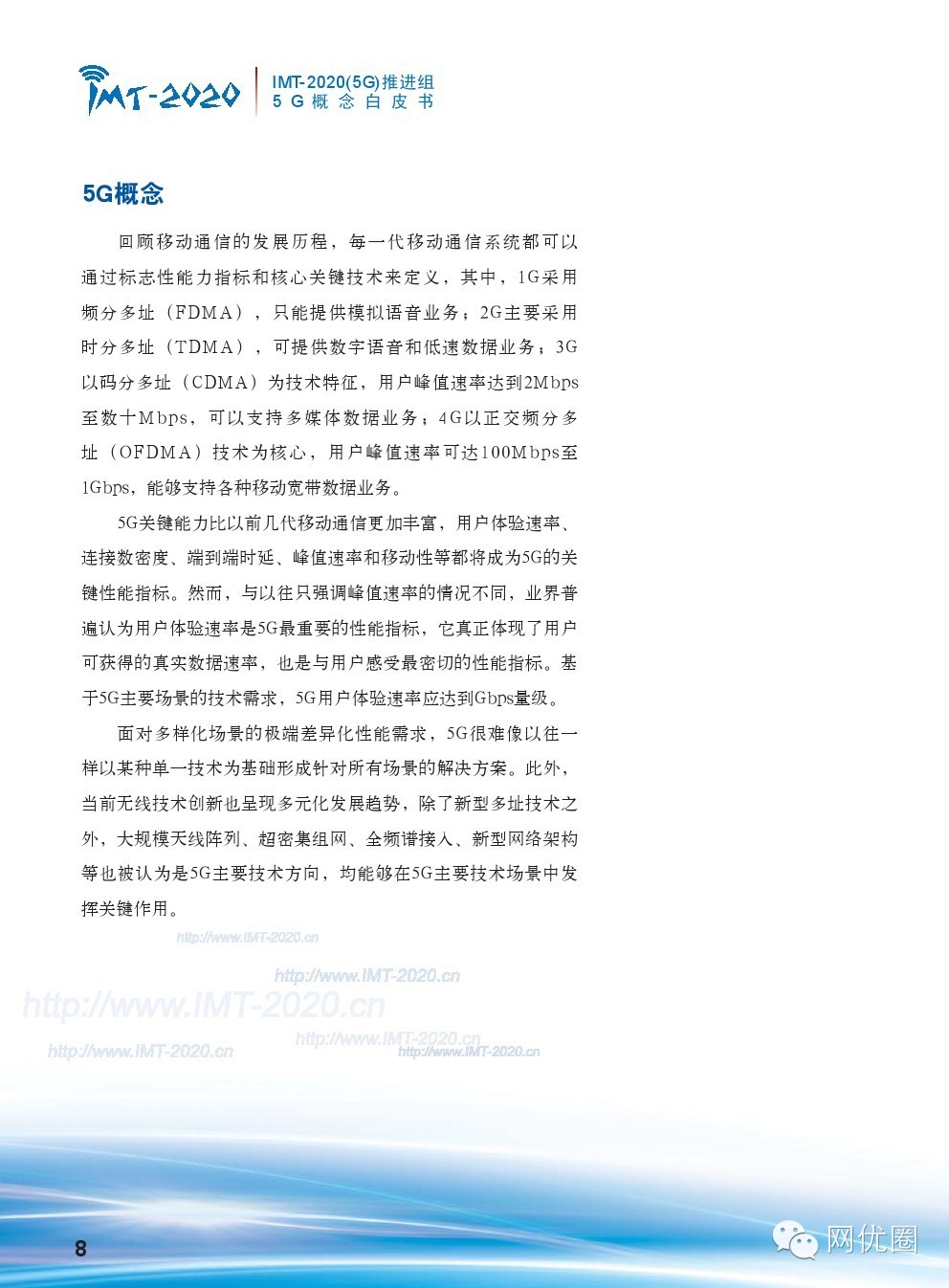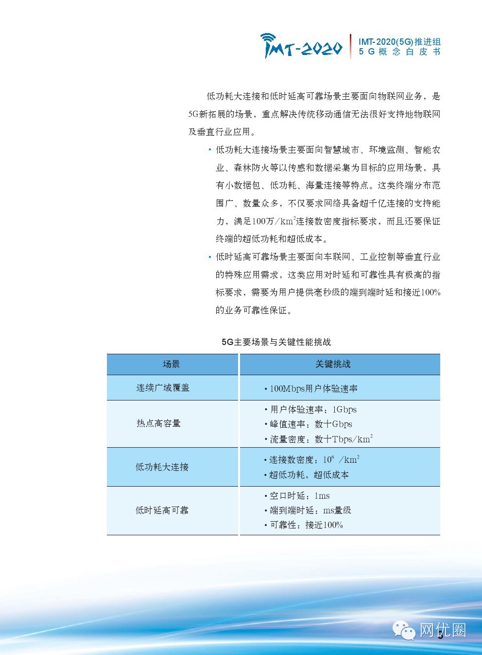 主页(http://www.pttcn.net):IMT-2020(5G)推进组:5G概念白皮书 【摘 要】 移动通信自20世纪80年代诞生以来,经过三十多年的爆发式增长,已成为连接人类社会的基础信息网络。移动通信的发展不仅深刻改变了人们的生活方式,而且已成为推动国民经济发展、提升社会信息化水平的重要引擎。随着4G进入规模商用阶段,面向2020年及未来的第五代移动通信(5G)已成为全球研发热点。在全球业界的共同努力下,5G愿景与关键能力需求已基本明确,预计2016年将启动国际标准制定工作。为使5G技术研发和标准化形成合力,需尽快明确5G概念、技术路线与核心技术,这将对凝聚全球业界力量,推动5G发展具有极其重要的意义。本白皮书从5G愿景与需求出发,分析归纳了5G主要技术场景、关键挑战和适用关键技术,提取了关键能力与核心技术特征并形成5G概念,在此基础上,结合标准与产业趋势,提出了5G适合的技术路线。 【目 录】 一、引言 二、5G技术场景 三、5G关键技术 四、5G概念 五、5G技术路线 六、总结与展望 七、主要贡献单位