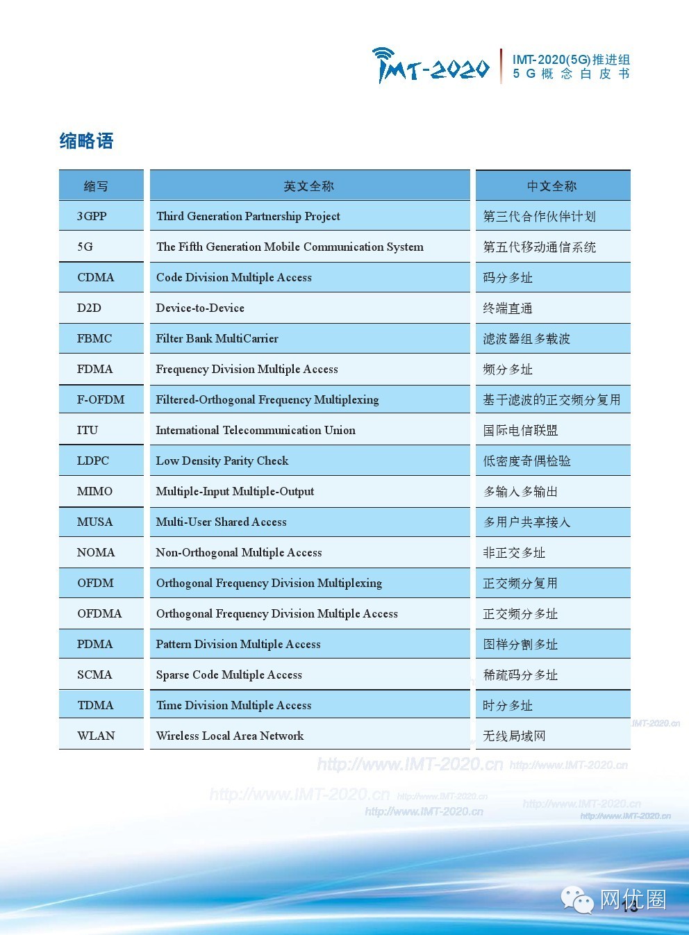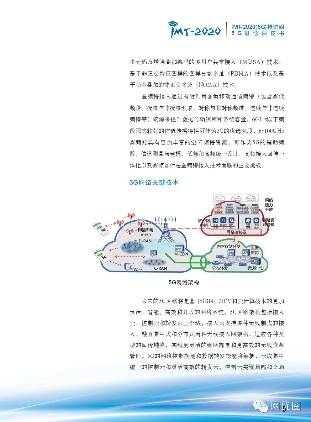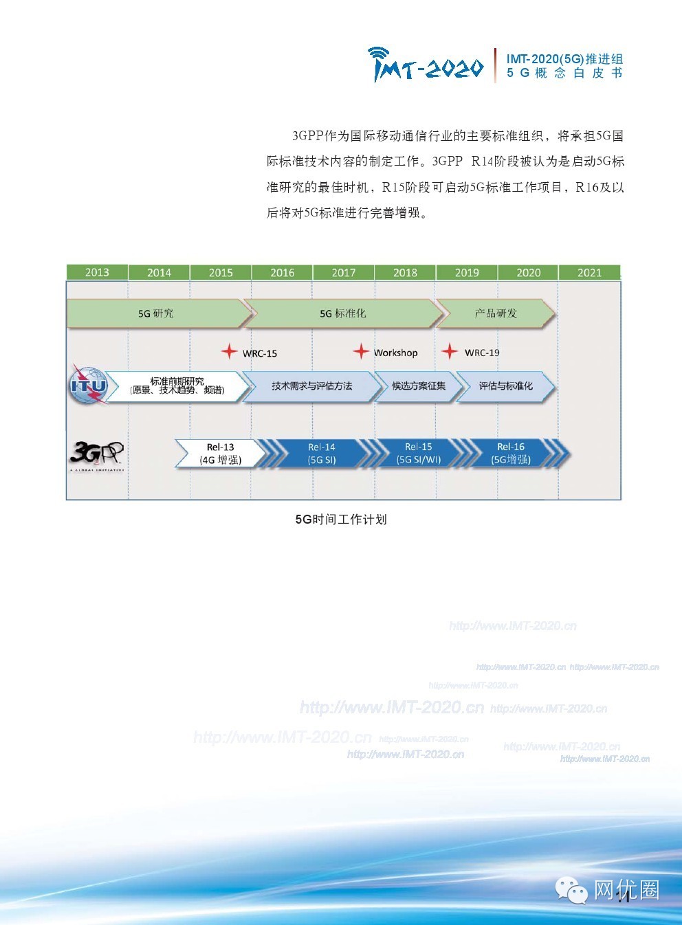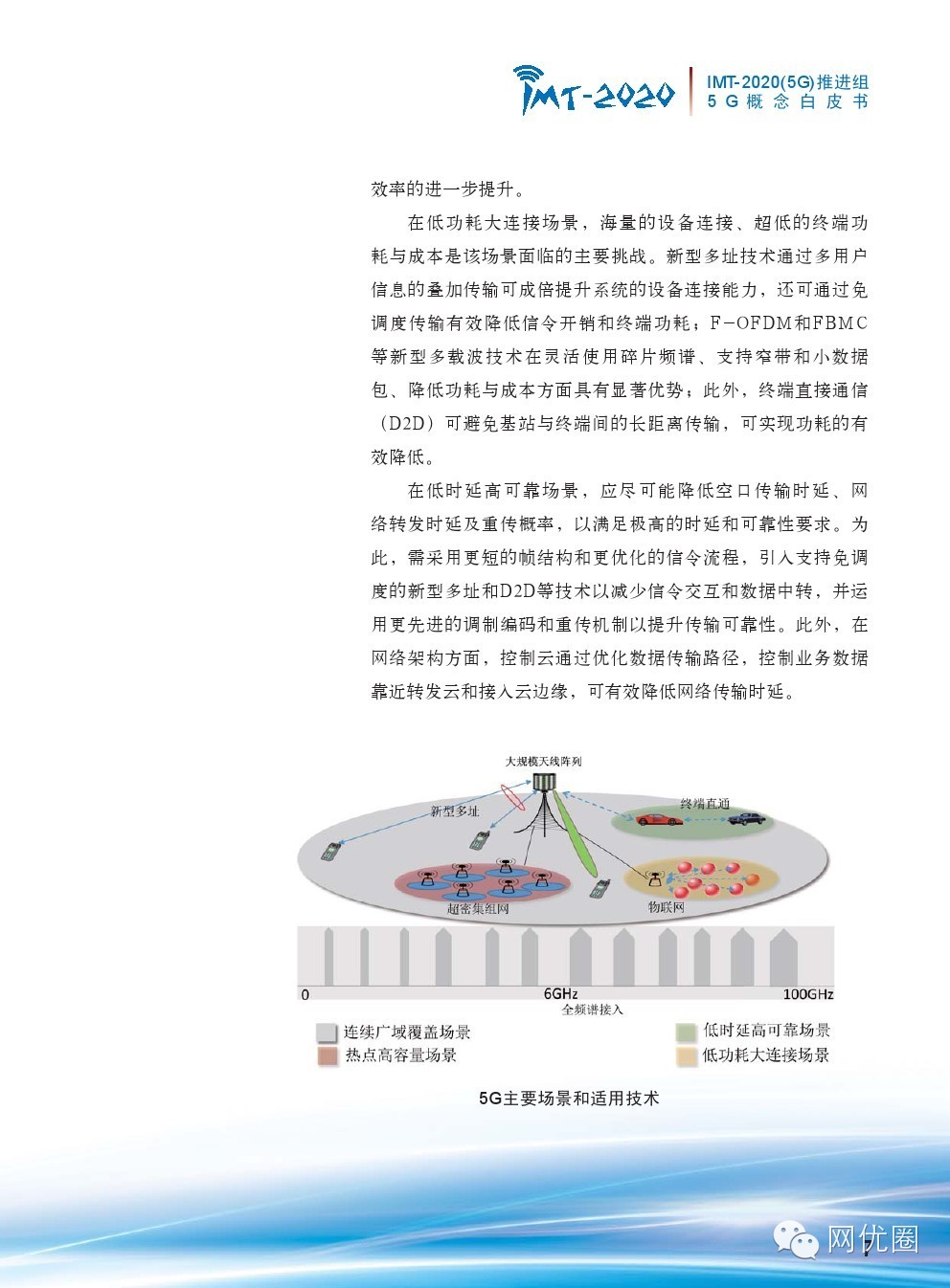 主页(http://www.pttcn.net):IMT-2020(5G)推进组:5G概念白皮书 【摘 要】 移动通信自20世纪80年代诞生以来,经过三十多年的爆发式增长,已成为连接人类社会的基础信息网络。移动通信的发展不仅深刻改变了人们的生活方式,而且已成为推动国民经济发展、提升社会信息化水平的重要引擎。随着4G进入规模商用阶段,面向2020年及未来的第五代移动通信(5G)已成为全球研发热点。在全球业界的共同努力下,5G愿景与关键能力需求已基本明确,预计2016年将启动国际标准制定工作。为使5G技术研发和标准化形成合力,需尽快明确5G概念、技术路线与核心技术,这将对凝聚全球业界力量,推动5G发展具有极其重要的意义。本白皮书从5G愿景与需求出发,分析归纳了5G主要技术场景、关键挑战和适用关键技术,提取了关键能力与核心技术特征并形成5G概念,在此基础上,结合标准与产业趋势,提出了5G适合的技术路线。 【目 录】 一、引言 二、5G技术场景 三、5G关键技术 四、5G概念 五、5G技术路线 六、总结与展望 七、主要贡献单位