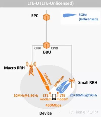 不同于传统的AP,该AP可识别PDCP,它能将来自BBU的PDCP包转换成802.11帧并转发给UE。 UE接收来自RRH 和 WiFi AP的PDCP包,在PDCP层上完成聚合后传递给更高层。 除了 PDCP层聚合,KT透露,他们正在研究如何在RLC层上实现链路聚合。 作为韩国的三大运营商之一,KT拥有最多WiFi热点,他们已经将所有AP升级为GiGA WiFi AP,并建立了一张专用GE回传网络,KT计划在2016年上半年试商用LTE-H,通过LTE与WiFi聚合,实现Gbit级的网络速率大提升。 尽管LTE-H是个不错的解决方案,不过,它也面临着两大问题: 1)如何计费? WiFi是免费的,LTE是收费的。在LTE网络,P-GW负责计数用户消费的数据包数量。在LTE-H下,来自WiFi的数据包不应被计数,因为它是免费的。那么,这就要求P-GW必须知道哪些数据包是来自LTE的?哪些数据包来自WiFi? 这几乎是mission impossible。 唯一可行的方法是由BBU来区分LTE 和 WiFi数据包,对其计数后通知P-GW或者计费服务器,这是一次计费方式的颠覆,所以在商业化的过程中还会遇到一些计数问题和计费策略问题。 2)AP分布较广,如何将这么多AP连接到BBU? 另外,合并LTE和WiFi数据会带来一定时延,这就要求更理想的回传,以保证时延最小。 再来看看LTE-U。 同样基于C-RAN构架,我们把基站分离成BBU和RRU。 在LTE-U下,就相当于BBU连接了两个RRU,一个是LTE 1.8GHz频段下的RRU,一个是未授权频段5GHz下的RRU,两者都通过CPRI接口连接BBU。