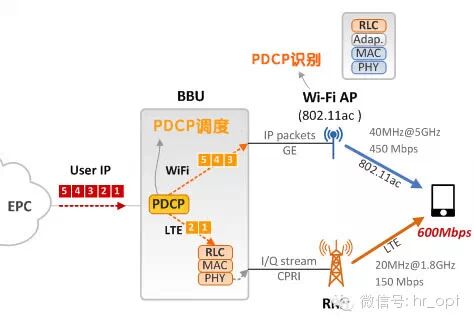 在BBU PDCP层,PDCP调度器将PDCP数据包分成两组,一组通过CPRI接口指派给RRH,一组通过以太网指派给WiFi AP 。