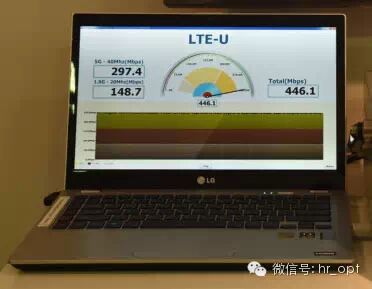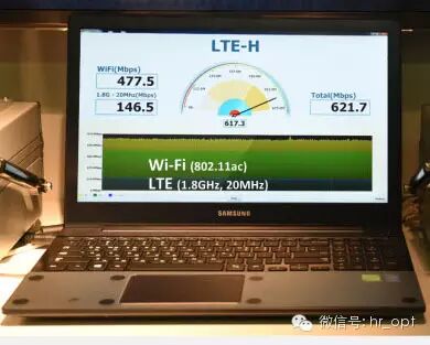 LTE-H是什么,即LTE-Hetnet,或者叫LTE/WiFi链路聚合,和LTE-U目的一样,不过过程更温柔!它是一种链路聚合技术,它合并两种不同的无线接入技术——LTE和WiFi,从而大大提升网络速率。但是,它区部于LTE-U。 韩国运营商KT首次成功演示了LTE-U,下图就是KT在今年WMC上的演示,LTE-H聚合LTE 150Mbps速率和WiFi AP 450Mbps速率,从而达到聚合速率600Mbps。
