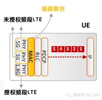 其实,LTE-U和LTE-A 载波聚合非常相似,主要有两点不同: 1)LTE-U使用5GHz 未授权频段 2)使用授权频段的小区总是作为主小区,而使用未授权频段的小区作为从小区。这就是说,移动终端总会优先连接授权频段,而未授权频段只有在被主小区激活后,才能作为补充使用。 另外,不同于LTE-H,LTE-U与LTE-A 载波聚合一样,都在MAC层完成聚合,如下图所示: