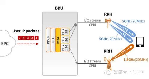 如上图所示,LTE 1.8GHz频段20MHz,5GHz RRU频段40MHz,两者合并一共60MHz,这相当于3载波聚合,可提供450Mbps峰值速率。