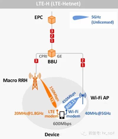 它是如何实现的呢? 首先需要一个C-RAN构架,将基站分离成BBU和RRU部分,也就是我们说的射频拉远。RRU和BBU通过CPRI接口连接。采用基于802.11ac的 GiGA WiFi AP,WiFi AP通过吉比特以太网(gigabit Ethernet)接口连接到BBU。 RRH使用LTE 1.8GHz频段上的20MHz频段,而AP使用WiFi 5GHz频段上的40MHz频段,终端可以同时从RRH 和 WiFi AP 接收数据。