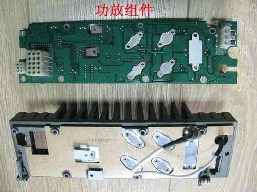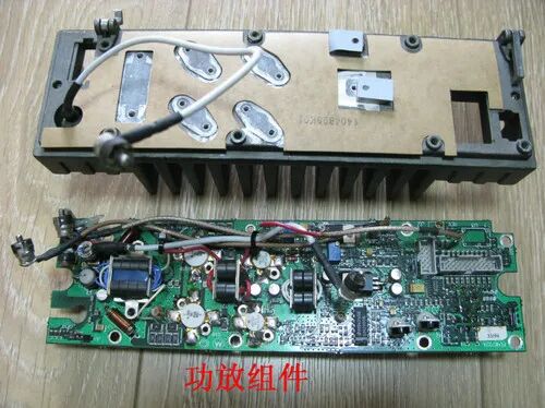 经过测试对比,发现故障机的Q1~Q19在静态状态下的电压比模机低一些,但是在发射状态下,故障机电压值都比模机低1V左右。会不会就是这1V之差说明功放板某个地方有漏电或是哪个元件有漏电的故障存在呢?为了谨慎起见,先不考虑动烙铁拆焊元件,先将功放印刷电路板从散热器上拆下来检查,如图: XF的功放板的印刷电路板只需将各个螺丝拆下,即可与散热器分离,无需动烙铁,经查也没发现异常,顺手用酒精棉球作了清洁(也没有不洁问题)。于是将功放裸板直接上机加电再测试。结果发现静态工作电压值全部达到与模机一样的数据。心里一喜,有门!遂将功放板装回散热器作发射电压测试,结果更是喜出望外,在发射状态下的各个电压值也恢复到了与模机一样的数据,见表二: 表二:重新装好后的功放主要元件电压对比值