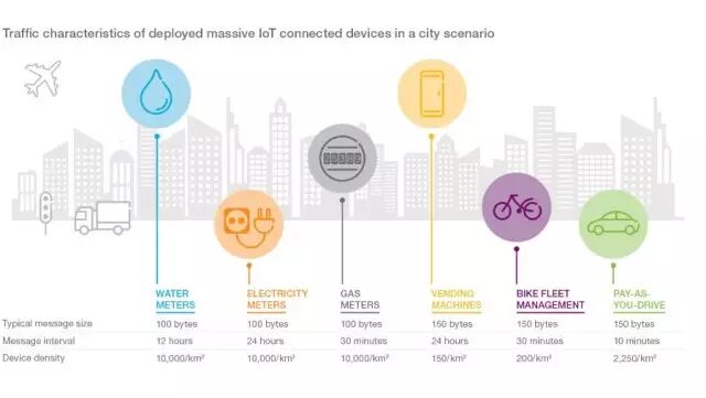 主页(http://www.pttcn.net):城市大规模物联网,让智能无处不在 关键物联网连接的特点是要求很强的可靠性和可用性,以及超低的延迟。比如交通安全、自动驾驶汽车、工业应用和医疗保健(包括远程手术)。 另一方面,大规模物联网的特点是具有海量连接、低数据量、低成本终端和对能耗的严格要求;示例包括智能建筑、智能电表、运输物流、车队管理、工业监控和农业。 互补型物联网技术 这两个领域有大量具有不同连接要求的大量用例。蜂窝网络适用于支持这两个领域,虽然没有单个技术适合于所有潜在情况。为了满足不同潜在大规模物联网应用用例的要求,几个蜂窝物联网技术正在标准化,包括扩展覆盖GSM-IoT、EC-GSM IoT、Cat-M1和窄带物联网(NB-IoT)。 根据技术可用性,用例需求和部署场景,这些解决方案可以互补。例如,EC-GSM服务于所有GSM市场的应用,Cat-M1支持广泛的物联网应用,包括内容丰富的应用,而NB-IoT针对超低吞吐量应用进行了简化,并提供极好的覆盖和部署灵活性。运营商是选择一个解决方案,还是结合几个解决方案取决于几个因素,如技术覆盖、网络技术策略和具体的目标市场。 超低端大规模物联网应用 要检查蜂窝网络承载物联网流量的能力,需要了解物联网服务的真实场景及其网络影响因素。我们的场景包括由一系列不同物联网服务组成的流量模型,包括对每个终端消息大小和流量强度的假设,以及在密集城市环境中部署的终端数量。它专注于对吞吐量要求有限的超低端物联网应用,例如计量和监控用例,因为这些应用将成为许多市场中部署的首批大规模物联网服务。 大规模物联网流量场景 每平方公里有1万户家庭的密集城市环境,类似伦敦、北京或纽约的中心地区,被用作大规模物联网服务场景的基础。假设在该地区部署了一系列不同类型的互联终端,包括水、煤气表和电表、自动售货机、租赁自行车位置监控器和汽车中(见脚注1)监控驾驶员行为的加速度传感器。上图中总结了每个终端的流量特征。(见脚注2) 此场景中使用的联网终端的数量代表成熟的大规模物联网场景。在初始部署阶段,终端密度将较低,相应的流量负载也不会那么高。 这些服务代表了现实的大规模物联网用例范围,这些用例预计将部署在城市环境中。 这些服务的部署环境和流量模型不同:远程控制仪表可能面临室内覆盖挑战,而安装在自行车上的终端通常位于室外。仪表流量可能每天集中传输一次,而其他终端可能需要每10分钟传输一次。 大规模物联网终端的数据流量很小;一个服务的典型数据包大约为100-150个字节,其中考虑了终端ID的有效载荷、时间戳和报告数据值。 此外,每个数据包都有大约65个字节的IP开销和更高层报头;媒体访问控制(MAC)层开销为15个字节,移动网络上行链路每个事件的标准控制信令为59个字节。总之,每个事件产生大约250-300个字节,由物联网终端传输。 上页图中显示了产生的流量需求。它清晰表明,尽管终端的密度非常高,每个终端的流量很低,每单位面积的流量限制为每平方公里几千比特/每秒(kbps), 而移动宽带业务在密集城市地区为每平方公里接近千兆比特/每秒(Gbps)。 脚注: 1. 基于每个家庭一辆汽车,每四个流量一组计算平均值。 2. 在这种情况下,上行链路流量为主导,下行链路流量用于应用确认(ACK和终端之间的控制平面信令(RRC), 无线接入网络相对较小。 3。 Orange、爱立信、“传统GPRS MTC流量模式”(2016年2月15 日- 19日),文档GP 160060,3GPP GERAN 69号会议。 部署NB-IoT载波 实现大规模物联网服务场景 NB-IoT适用于超低端物联网应用。基站可以与终端通信的下行/上行最高瞬时数据速率为227 / 250kbps,而每个终端的持续最大吞吐量为21 / 63kbps,足以支持城市情景中的服务。虽然其容量低于移动宽带,但系统级仿真显示,一个180 kHz 的NB-IoT载波可以承载数十kbps——具体取决于载波配置。假设单个NB-IoT载波在3个扇区站点部署,城市环境典型的站点间距离为500米,可实现每平方公里数百kbps的区域容量。这比我们密集的城市情景中大规模物联网服务流量的需求大得多。 下图说明了在我们的城市情景中,大规模物联网累积流量与单个NB-IoT载波的容量之间的关系。所有大规模物联网服务的总流量总计占总可用容量的6%,这表明在需要另一个NB-IoT运营商之前,可以支持在所考虑的情况下将大规模物联网流量增加15倍。此外,Cat-M1与NB-IoT相比支持更高的数据速率和容量。 除业务所需的容量外,覆盖挑战性位置中的终端至关重要。因此,NB-IoT和Cat-M1设计提供比GSM和LTE显著更好的覆盖。这种改进的覆盖允许无线电信号穿透附加壁垒或红外反射(IRR)金属化玻璃窗,可以到达部署在室内深处或地下室(典型的仪表位置)的终端。 创造商机 蜂窝网络可以处理大量大规模物联网终端,对网络容量的影响最小。我们的方案显示,单一NB-IoT载波(部署在保护频带或带内,占用10 MHz LTE载波的2%)明显超出了所考虑的大规模物联网服务的需求。这些发现意味着NB-IoT的初步部署可满足潜在的更高数据需求和流量强度,也能够支持其他类型的服务。 通常,运营商可能不怎么升级现有网络以支持物联网业务,但是该领域的潜在价值巨大。可以从单个基站为成千上万的物联网终端提供连接是重要的推动力量,可以带来新商机。 物联网展望 随着新兴应用和商业模式的涌现,以及标准化和终端成