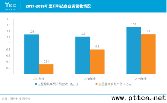 与此同时,盟升卫星通信产品收入持续高增长。2017年-2019年,“卫星通信”产品收入分别为0.31亿元、0.80亿元、1.30亿元,增长明显。
