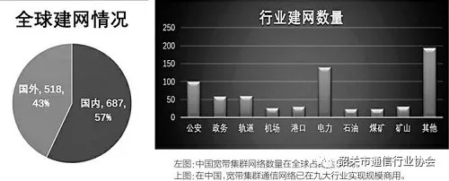 截至目前,全球共建设宽带集群网络1205张,我国商用网络达687张,占比达到了57%;国外商用网络为518张,占比为43%。