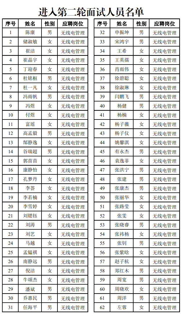 主页(http://www.pttcn.net):国家无线电监测中心2022年校园招聘面试公告 根据第一轮线上面试情况,确定应聘我中心的下列人员进入第二轮面试,名单详见附件。现将第二轮面试有关事项公告如下: 一、面试安排 (一)面试 时间:2022年3月24日(周四)9:00-17:30。 内容:专业考察、英语考察、综合考察等。 方式:通过腾讯会议进行在线面试。 (二)笔试 时间:2022年3月25日(周五)10:00-11:30。 内容:写作。 方式:线上进行。 二、面试要求 (一)请参加面试人员于2022年3月22日(周二)12:00前扫描以下二维码进入微信群。 进群后请按照“序号+姓名”的格式修改群昵称(如:56-张三,序号见附件),随时关注群公告。 (二)请参加面试人员于2022年3月22日(周二)17:00前将以下材料电子版扫描件发送至招聘邮箱(zhaopin@srrc.org.cn): 1.应届毕业生就业推荐表、就业协议书; 2.学位证、毕业证(研究生还需提供本科期间取得的学位证和毕业证); 3.本人研究生期间学习成绩单; 4.英语四、六级证书; 5.本人身份证; 6.其他能够证明自身能力的材料。 应聘人员应对本人提供的材料的真实性负责,经查验不属实或与网上报名信息不符的,我中心有权取消其面试及录用资格。 三、其他事项 面试结束后,我中心将通过本网站和电话通知后续事宜。请参加面试人员注意及时浏览本网站相关信息,并保持通讯通畅。如遇号码变更,请务必提前与我中心取得联系。 联系电话:国家无线电监测中心人事处010-68009044。 (中国集群通信网 | 责任编辑:李俊勇) |