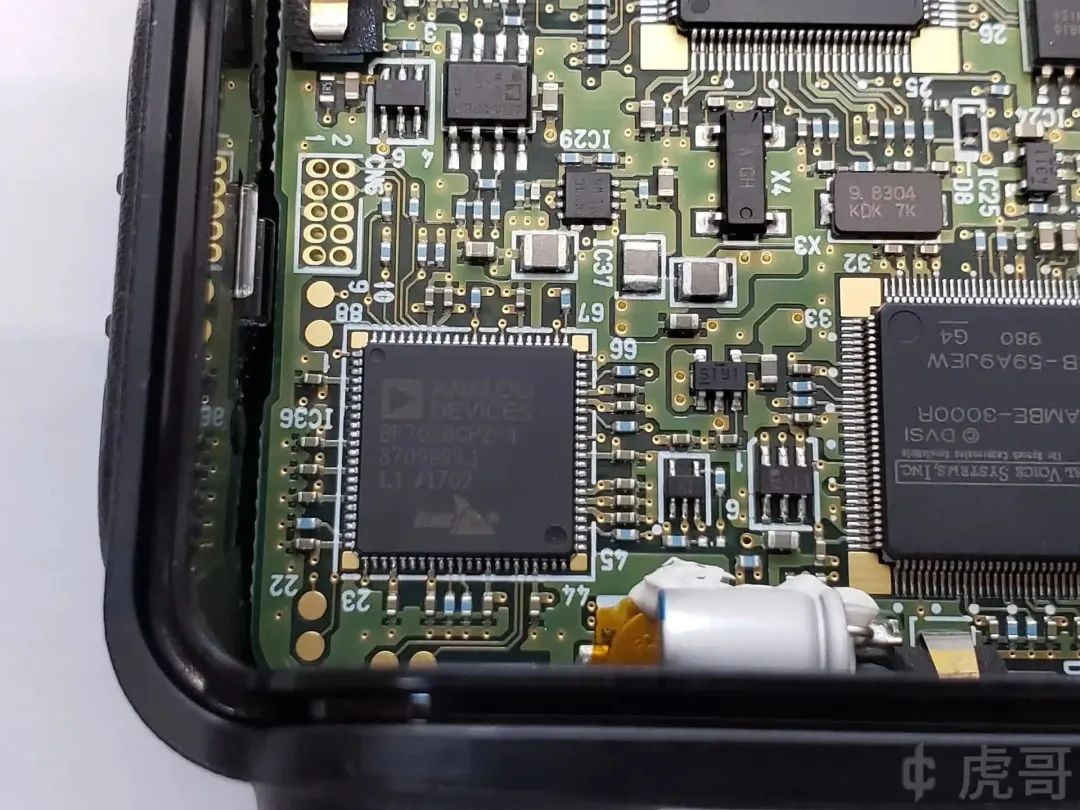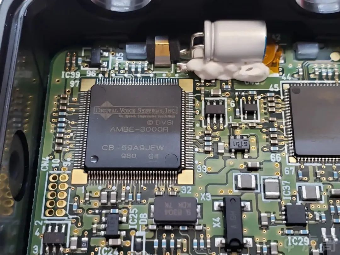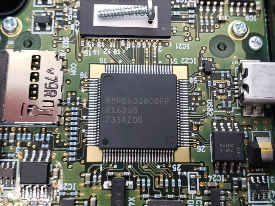 而解出的音频数据流,进了这个AMBE-3000声码器。这个机器据说还支持别的一些声码器,可能是软解的。 正中心的这颗100M的瑞萨单片机,应该负责处理UI和管理整个数字电路。瑞萨的单片机其实很厉害,只是在中国不太流行,且一般是按订单生产,货架化型号较少。
