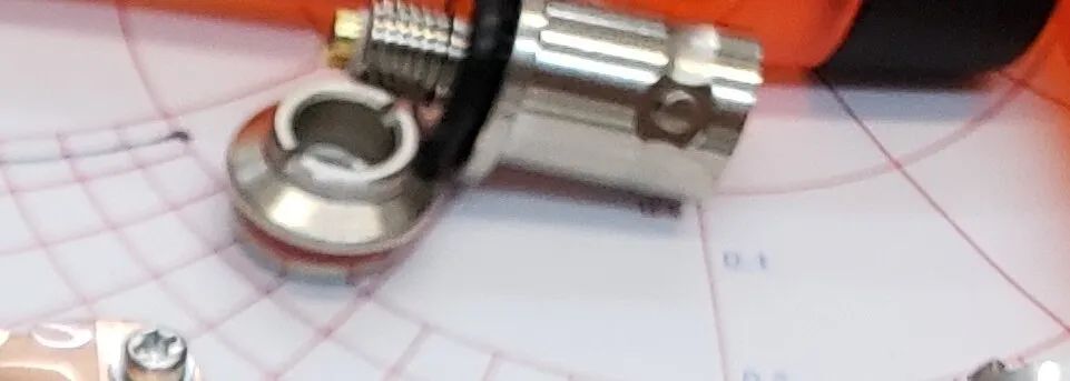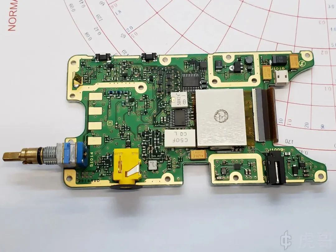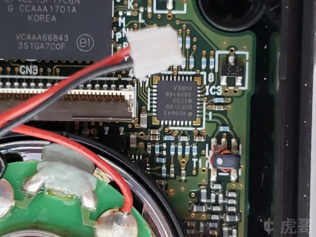 这个视频是解调一个以DMR协议工作的MMDVM中继的结果,似乎效果不怎么样,有时解不开。  拆射频接头(天线插座)遇到了麻烦,外表看是一个螺母压住的,但仔细看似乎没有缝隙,似乎接头与机壳是一体的。拆掉金属甲板下方的两颗螺丝后,撬动甲板,天线处塑料变形,看起来需要拆掉。用不同电压的X光翻来覆去看了几遍,感觉这个天线插座是一个独立的,可以从外面拧下的零件。于是上大力,果然拧下来了。 但是忘了给他拍照,只在一张废片的角落找到了它,如下。左边的螺母是编码器旋钮的固定螺母,上方就是天线插座,黑色是橡胶密封圈。 拆掉天线插座和编码器螺母以后,甲板就很容易取下来了。可见,射频部分面积较小,全部位于甲板上的电路板内,被铜箔覆盖屏蔽。靠近面板一侧有一整张电路板,全部是数字电路。 我们先来看数字电路。首先看到的是ADC,这是一支14位20M采样率的ADC。想必是欠采样工作或超频工作。 ADC的数据马上进入了EP4CE15,这是一只比较小的FPGA,好处是省电。