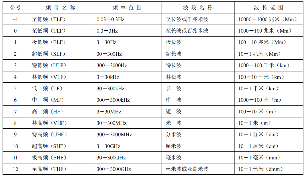 主页(http://www.pttcn.net):无线电频段和波段的命名 无线电频谱可分为下面表中的 14 个频段,无线电频率以 Hz(赫兹)为单位,其表达方 式为: —— 3000kHz 以下(包括 3000kHz),以 kHz(千赫兹)表示; —— 3MHz 以上至 3000MHz(包括 3000MHz),以 MHz(兆赫兹)表示; —— 3GHz 以上至 3000GHz(包括 3000GHz),以 GHz(吉赫兹)表示。 数据来源于:《中华人民共和国无线电频率划分规定》2023版 注:频率范围(波长范围亦类似)均含上限、不含下限;相应名词非正式标准,仅作 简化称呼参考之用。 注 1:“频段 N”(N = 带号)从 0.3×10N Hz 至 3×10N Hz。 注 2:词头:k = 千(103),M = 兆(106),G = 吉(109)。 (中国集群通信网 | 责任编辑:李俊勇) |