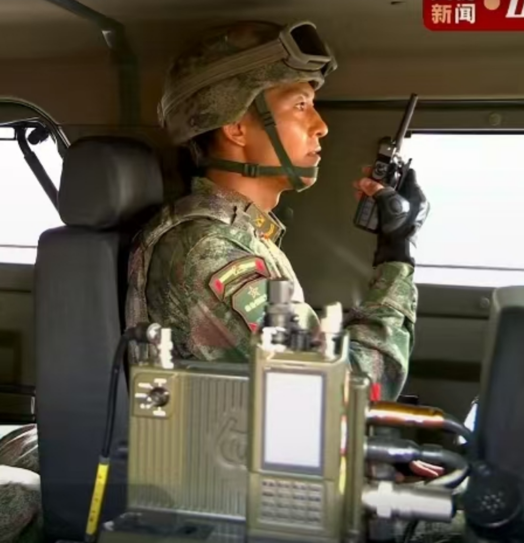 除了这个天线,还有比较眼尖的爱好者发现了整个阅兵中看到的唯一一个对讲机镜头?如下,是坦克中士兵正在使用对讲机进行沟通。
