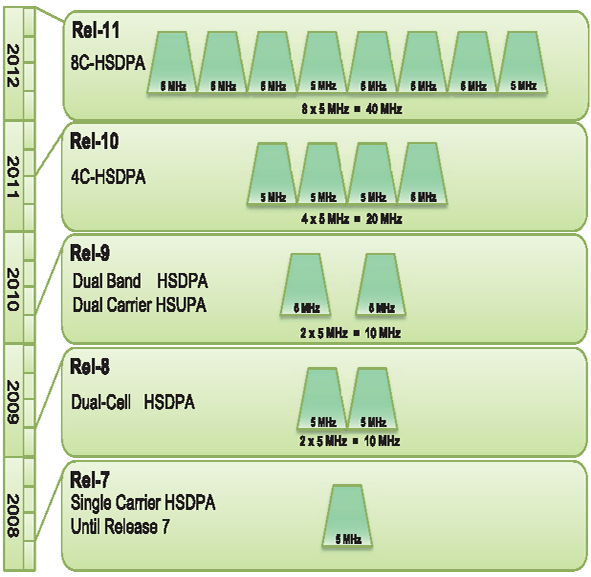 在随后的版本中,先前在3GPP 多轮多载波标准化过程中开发的标准化框架再次使用,在Release 10 中提供两个独立频段上的4载波HSDPA。
