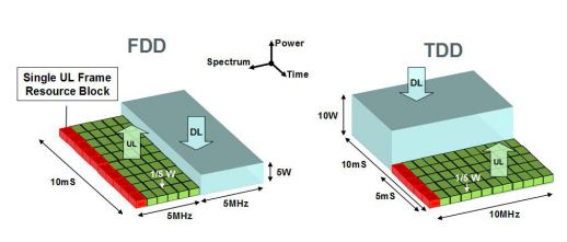换一个角度,从时域上看,一个10ms中,TDD上行链路可占用4ms(4个子帧),而FDD上行链路占用10ms,所以FDD较TDD模式可使用的RB资源更多,产生吞吐量越大.