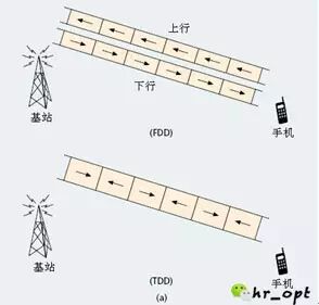 通俗一点讲,手机想上网,必须要建立上行和下行的通道:例如,你点击微信,手机会通过上行通道发送一个请求,然后微信服务器通过下行通道,把你最新的未读消息传到你的手机上。一般情况下,我们使用下行(下载)的时间比较多,而上行(上传)的时间很少。 为了建立起上行和下行的通道,FDD通过频率来分割,在两个对称频率上,一个管下载,一个管上传。就好像是双车道,两个方向的汽车互不干扰,畅通无阻。