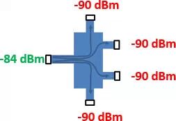 按照上表,一个4输出的功分器,输入信号为-84 dBm,那么每一输出端的信号就为-90 dBm。