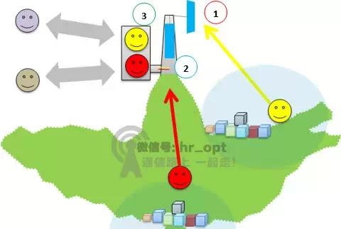 合路器多用于将多路信号合并在一条传输通道上传输。 我们仍然采用上面的例子。一个用户(黄色笑脸)的信号通过天线(1)到达BTS(2);另一个用户(红色笑脸)的信号通过天线(3)到达BTS(2)。在BTS,