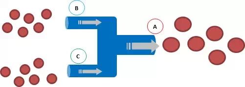 在功分器里,水就是射频信号,输入信号被分割,信号形式不变,但功率被分割。 在下图中,我们可以看到一个功分器的简单例子。A端的信号(大红色圆圈表示)分成B和C两路信号。