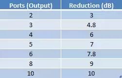 另外,两个蓝色小区的输出功率是黄色小区输出功率的一半。在工程设计的时候,一定要考虑这3dB的差距,特别是针对室内覆盖。 好了,现在我们已经看到了一个简单的功分器是如何工作的。 通常一个功分器不仅仅只有两路输出,比如,也有4路输出的功分器。在这种情况下,每个输出端的信号功率是输入信号的1/4。 不过,功分器会涉及到插入损耗,也就是系统中插入了功分器这一元器件带来的损耗。以上我们说输出信号是输入信号的1/4时,并没有考虑功分器本身的插入损耗。 那么,在实践中,各种类型的功分器有多大的损耗呢? 假设插入损耗为0,我们只考虑信号功率下降来源于一路分成多路,下面这张表分别列举了分工器的输出端口数和对应的信号电平降低数。