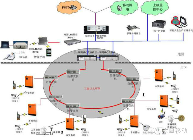 主页(http://www.pttcn.net):大唐移动:基于4G的矿用宽带无线通信平台 煤矿企业经历了第一代综合机械化建设、第二代集约化建设、第三代信息化建设三个发展阶段,煤矿的建设理念逐步由高产高效、安全高效向着本安、智能、生态的方向发展,以智能化建设为代表的第四代煤矿建设已经开启。 顺应市场需要,打造全新方案 矿用通信系统作为煤矿六大系统的重要组成部分,在现代化大中型矿山企业中正扮演着越来越重要的角色。传统的矿用有线通信系统只能提供语音通话、电话调度、会议汇接等基本功能,而且由于布放位置固定,调度效率较低、可调度范围较小,在灵活性、及时性方面都无法适应当前矿井高效安全生产的需要。 煤矿进入智能化建设时代,要求矿用通信系统除提供语音电话、语音调度功能之外,还能够承担文本、多媒体视频、监控数据等信息的传递。此外,直观、准确、快捷的生产调度和应急指挥,要求井下调度从单一的固定电话调度功能,上升为固话+移动,话音+视频的综合调度平台,同时,还可与人员定位、应急广播等其它系统整合联动。如何在宽带通信网络之上叠加更丰富的业务应用,适应智能化第四代煤矿信息化建设对传输承载的需求,成为了当前矿用通信系统建设的关键。 大唐移动发挥自身在LTE第四代移动通信技术方面的绝对优势,根据煤矿生产工艺特点和管理需求,研制开发了本安型矿用4G宽带无线调度通信系统解决方案。该方案凭借本安型设计理念、先进的技术、可靠的质量、丰富的业务,将为煤矿企业打造安全高效的宽带无线通信平台,成为第四代煤矿承载安全生产信息、实施高效管理的网络基础。 引入4G,扫除通信盲点 大唐移动矿用4G宽带无线调度通信系统解决方案,可实现井上、井下全方位、无盲点的4G专网覆盖,提供语音、视频、多媒体调度、集群对讲、数据传输、多方会议等业务,还可通过智能调度机实现有线、无线通信网络的统一号码管理、一体化调度。