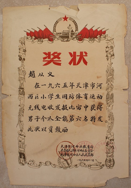 参与报务比赛获奖奖状 一分耕耘一分收获,经过半年多的训练,我们已经初步掌握了收发报的技能,代表学校先后参加了全区小学生和全市小学生无线电收发报比赛。我也因这次比赛受到奖励得到了一台崭新的电键。这台电键一直保存了很多年,后因多次搬家而丢失,真是可惜。
