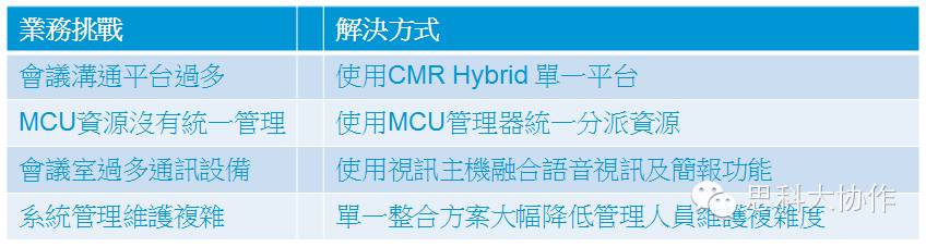 这个项目最大的特点就是客户大量使用多点视频控制器(MCU),把视讯多点控制器作为一个资源池的服务平台,所有员工不论是开启语音,视讯或是网络会议,都须透过这个资源池来实现多方会议。同时在此项目也协助客户减少会议室的通讯设备,以往一般中大型会议室,在每个会议室都需要有三个通讯设备,如办公室电话,会议电话及视讯主机,在思科的协助下把视讯与语音整合,让视讯主机都可以直接拨打外线及内线电话,把原有各个独立的通讯设备整合在一个视讯主机,大大的简化会议室内所需的通讯设备及减少IT人员对设备的维护,在小型三四人的会议室,使用思科的DX650连接到外接LCD屏幕,所有与会者直接透过外接屏幕可以清楚的观看远程的影像,当远程传送简报时外接LCD屏幕瞬间自动变为远程简报,让以往小会议室因价格考虑无法购买视讯主机,现在也可以享有视讯的服务。