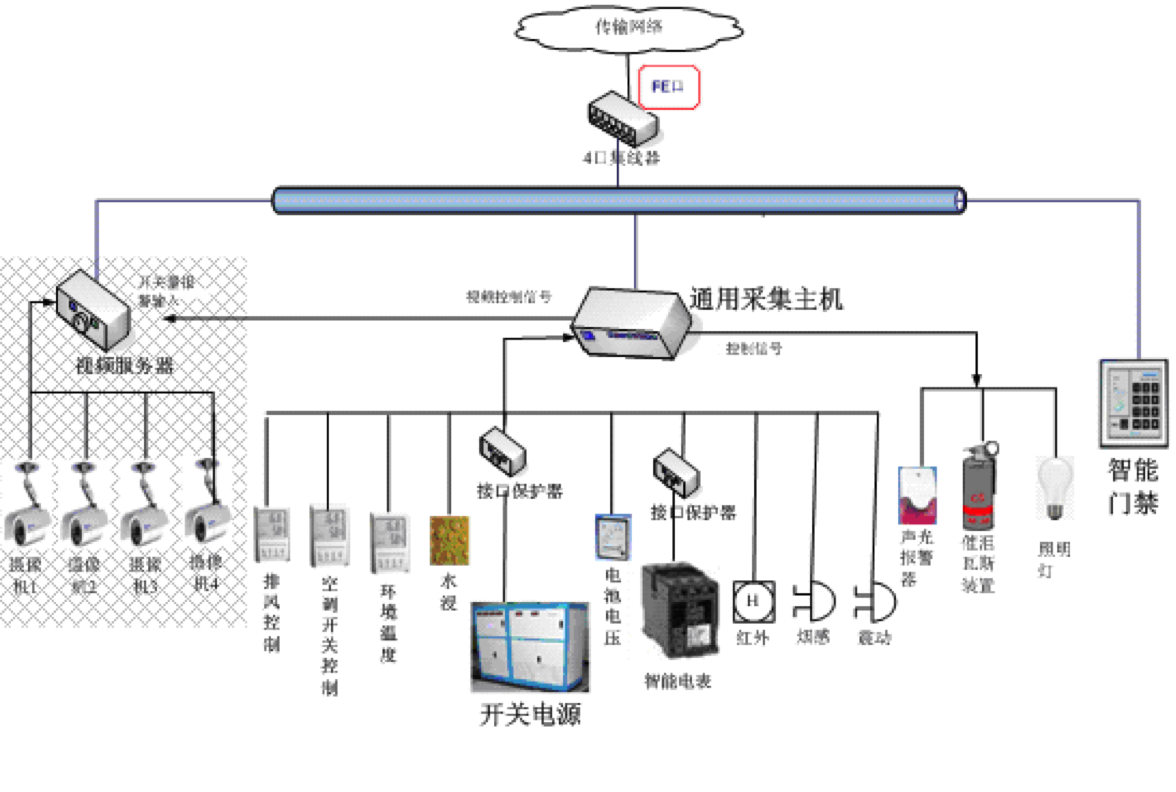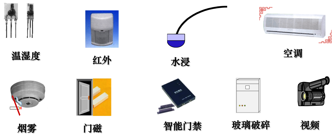 环境参量:温度、湿度、烟感、红外、玻璃破碎、水淹、门磁开关、智能门禁、手动报警开关、空调以及各个局站的现场视频等。