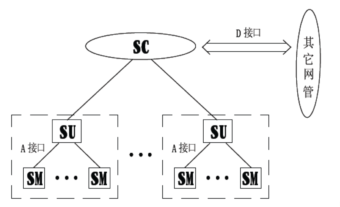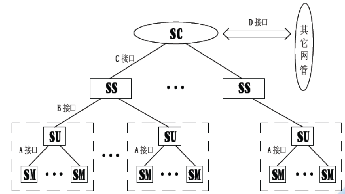 名词解释 监控中心Supervision Center(SC):本地网或者同等管理级别的网络管理中心。 区域监控中心Supervision Station(SS):区域管理维护单位。 监控单元Supervision Unit(SU):监控系统的最小子系统,由若干监控模块和其它辅助设备组成,监控范围一般为一个独立的通信局(站)或大型局站内一套相对独立的电源系统。 监控模块Supervision Module(SM):完成特定设备管理功能,并提供相应监控信息的设备。 监控系统三级网络结构和接口