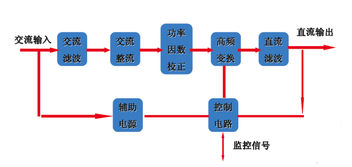 开关电源主要特点 重量轻、体积小 效率高(达90%以上) 功率因数高(大于0.92) 稳压精度高达0.2% 噪音低 维护方便 可靠性强 扩容方便 调试方便 便于实现集中监控、无人值守 对交流输入电源要求低 自动化程度高 存在高频谐波干扰 控制电路复杂 直流供电系统的设备 交换局内直流供电设备主要有高频开关电源整流器和与之配套的交流配电屏、直流配电屏,蓄电池组以及直流-直流变换器等。 移动基站或光缆、微波中继等通信站由于直流负荷通常较小,故多采用集交流配电、开关整流器和直流配电于一体的组合式开关电源。 交流配电屏