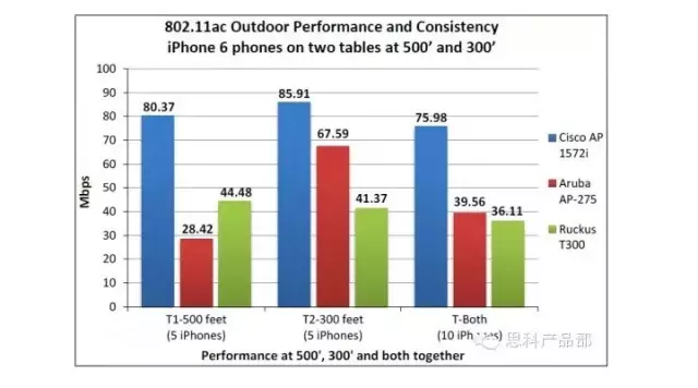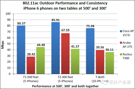 802.11ac为最新的IEEE无线标准在业界快速普及,对于室外Wi-Fi产品市场肯定也是不甘落后的快速演进到802.11ac行列。思科最近推出了业界第一款4x4,三个空间流的室外802.11ac无线接入点- Aironet 1570系列无线接入的。 考虑到更少的多径效应、树木和高楼的存在等这些开放空间室外环境的性质,关键是有一个强大而健壮的无线解决方案,帮助用户在室外实现802.11ac标准的真正好处。Miercom的最新测试报告有助于帮助您找出最理想的户外802.11ac解决方案这一答案。 通过对室外802.11ac无线接入点进行综合性能测试和评估分析,分别对三个供应商的旗舰级室外无线接入点进行了吞吐量性能、覆盖一致性和功能测试。这包括思科AP1572无线接入点、ArubaAP275无线接入点和RuckusAPT300无线接入点。 该测试报告涵盖了四个方面的测试内容,它们提供了对每个厂商无线接入点在真实部署环境中的性能评估。我们来看看每个测试场景中的测试结果。 户外多客户端性能和覆盖一致性 可以在各种不同覆盖范围实现高性能固然重要,但是更重要的是覆盖的一致性。为了测试一致性因素,两组苹果最近发布的802.11aciPhone 6智能手机被用来测试,每组5台,它们被放置在同一个室外测试环境。每5台iPhone6被放置在一个桌子上,并分别在距离无线接入点350英尺和500英尺的位置进行测试,如下图所示。