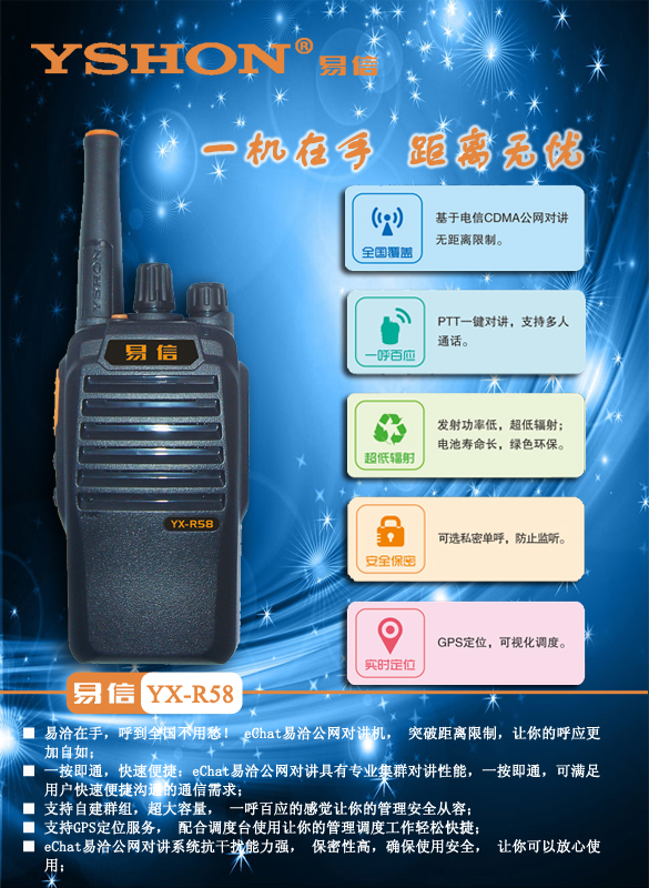 主页(http://www.pttcn.net):YX-R58易洽(eChat)公网对讲机 冲出国门,走向世界!力声通信公司感谢国内及海外客户的大力支持与厚爱,应市场需求:经过我司严谨的软硬件设计与审核,进行了反复的工程样品破坏性试验与升级,现重磅推出YX-R58易洽(eChat)公网对讲机。