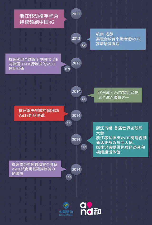 杭州是中国移动2014年五个VoLTE试点验证城市(杭州、广州、南京、福州、长沙)中首个成功部署的城市,是中国移动“实施下一代融合通信”战略的里程碑式项目,同时这也是全球第一张基于大规模TD-LTE网络下的VoLTE业务网络,具有国际性的示范意义。 2014年12月,杭州移动4G网络迎来了里程碑时刻,率先完成了VoLTE试商用网络的所有测试,做好了VoLTE试商用的网络侧准备工作。杭州成为中国移动首个具备VoLTE试商用基础网络能力的城市。 2014年,浙江移动新建设了超过200万用户的装机容量IMS核心网络,升级改造了杭州城区所有4G基站,共计7000多套,并对各种复杂网络条件下的业务质量进行了测试与优化,如西湖景区、高速/高铁、密集楼宇、电梯间、地下车库等,实现VoLTE业务能力在杭州城区全面覆盖。 浙江移动与华为成立了联合项目组,调派了精干力量参与此重大项目,紧盯2014年底2015年初 VoLTE试商用的目标,打破常规,加快推进网络测试与改造工作。针对期间涉及网络建设、终端、业务、用户发展等方面所面临的几大关键挑战,双方积极探索与实践,积累了大量宝贵经验。 确保VoLTE话音的连续性: 2014年11月底,VoLTE长呼则遍布杭州核心城区大街小巷保持不掉话,期间基站间切换超过1000次,用户完全无感知。 VoLTE网络互通/漫游: 浙江移动VoLTE网络已经完成了与广东、江苏、湖南、福建等省份间的VoLTE互通和漫游测试,充分验证了跨省份多厂家的网络互联互通能力。 固定与移动融合部署: 基于现网IMS改造升级支持VoLTE,是中国移动集团推荐方案之一,浙江第一个实施并验证了此方案。 端到端运营维护: 改变从传统的“段到段”到全新的“端到端”的管理模式,浙江移动在VoLTE 商用进程中同步部署华为SQM(Service Quality Management)业务质量和客户感知管理系统,极大提升了浙江移动VoLTE运营管理能力和效率。